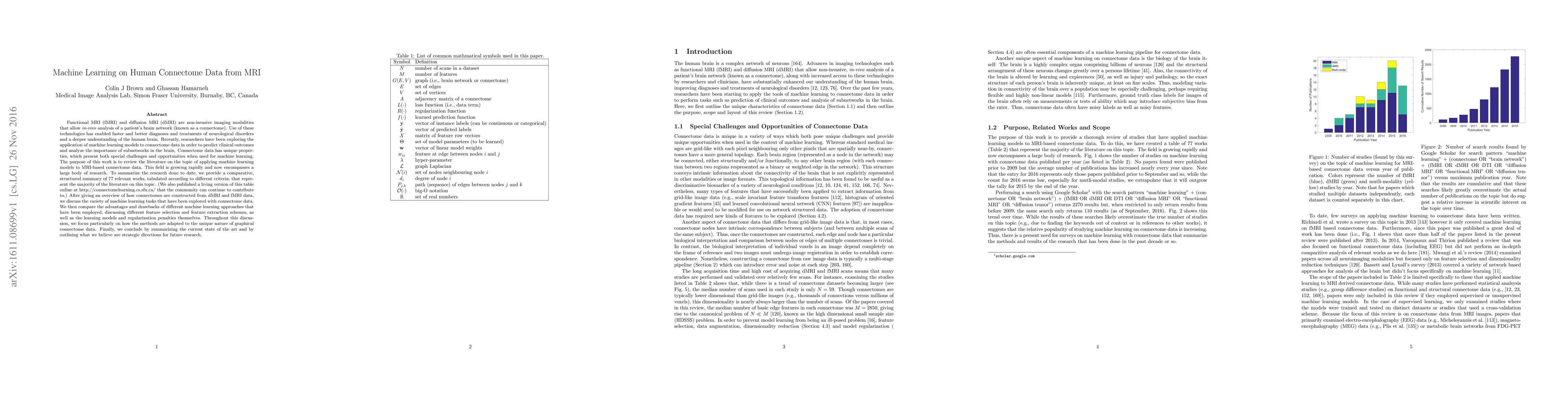 This paper reviews the application of machine learning to MRI-based human connectome data, summarizing 77 studies to highlight various machine learning tasks and approaches. It discusses the unique challenges of connectome data and compares different feature selection and extraction methods, concluding with current advancements and future research directions.