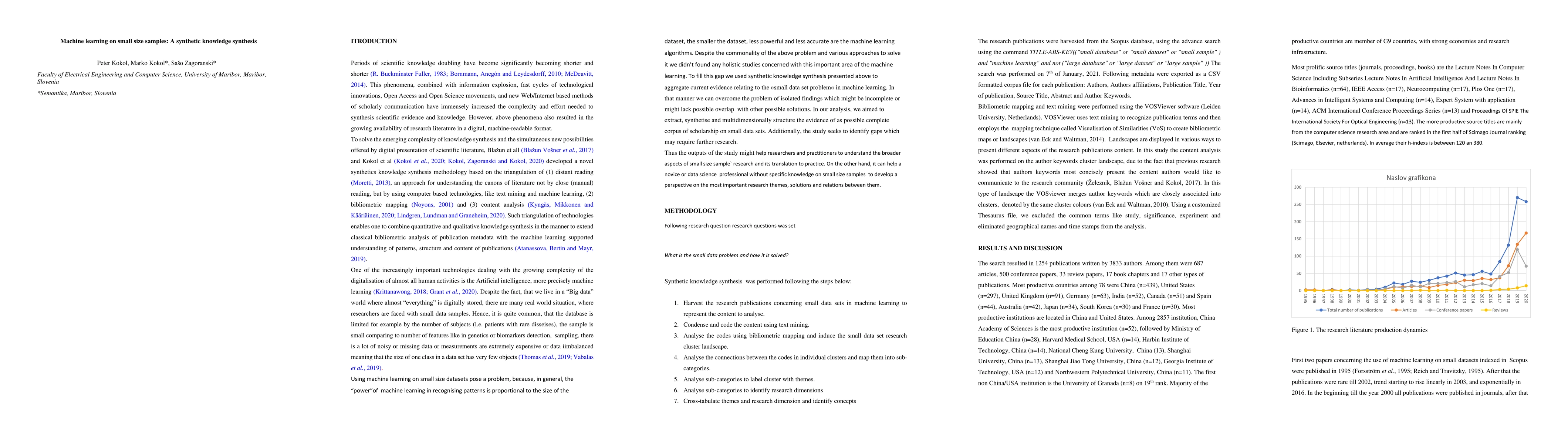 One of the increasingly important technologies dealing with the growing complexity of the digitalization of almost all human activities is Artificial intelligence, more precisely machine learning Despite the fact, that we live in a Big data world where almost everything is digitally stored, there are many real-world situations, where researchers are faced with small data samples. The present study aim is to answer the following research question namely What is the small data problem in machine learning and how it is solved?. Our bibliometric study showed a positive trend in the number of research publications concerning the use of small datasets and substantial growth of the research community dealing with the small dataset problem, indicating that the research field is moving toward higher maturity levels. Despite notable international cooperation, the regional concentration of research literature production in economically more developed countries was observed.