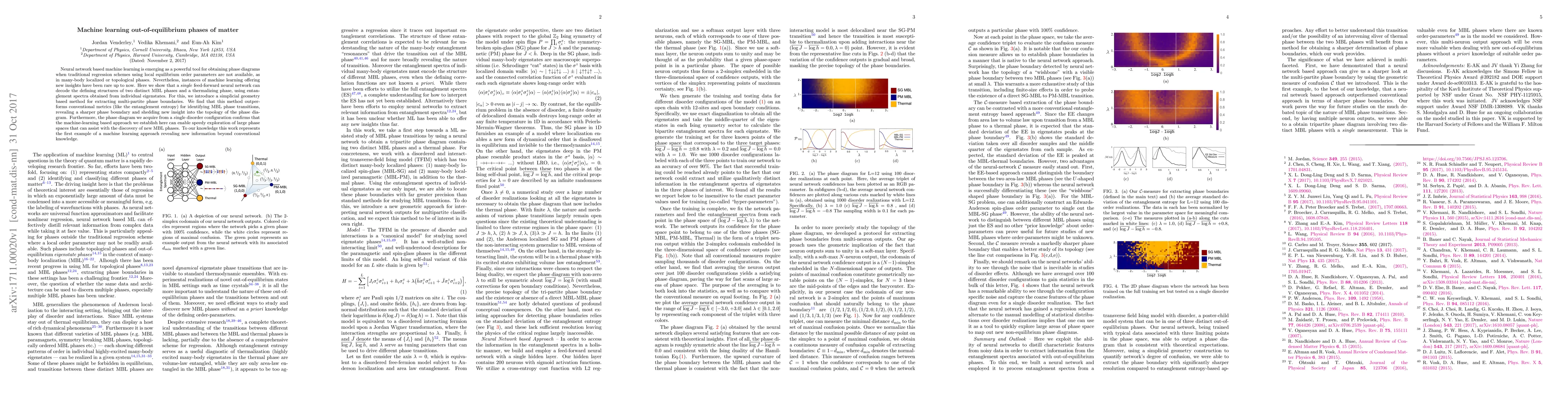 Neural network based machine learning is emerging as a powerful tool for obtaining phase diagrams when traditional regression schemes using local equilibrium order parameters are not available, as in many-body localized or topological phases. Nevertheless, instances of machine learning offering new insights have been rare up to now. Here we show that a single feed-forward neural network can decode the defining structures of two distinct MBL phases and a thermalizing phase, using entanglement spectra obtained from individual eigenstates. For this, we introduce a simplicial geometry based method for extracting multi-partite phase boundaries. We find that this method outperforms conventional metrics (like the entanglement entropy) for identifying MBL phase transitions, revealing a sharper phase boundary and shedding new insight into the topology of the phase diagram. Furthermore, the phase diagram we acquire from a single disorder configuration confirms that the machine-learning based approach we establish here can enable speedy exploration of large phase spaces that can assist with the discovery of new MBL phases. To our knowledge this work represents the first example of a machine learning approach revealing new information beyond conventional knowledge.