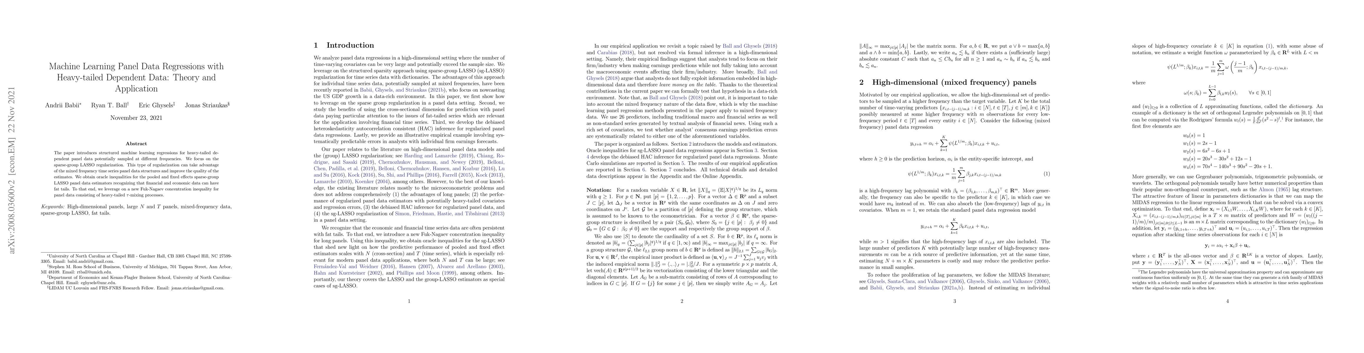 The paper introduces structured machine learning regressions for heavy-tailed dependent panel data potentially sampled at different frequencies. We focus on the sparse-group LASSO regularization. This type of regularization can take advantage of the mixed frequency time series panel data structures and improve the quality of the estimates. We obtain oracle inequalities for the pooled and fixed effects sparse-group LASSO panel data estimators recognizing that financial and economic data can have fat tails. To that end, we leverage on a new Fuk-Nagaev concentration inequality for panel data consisting of heavy-tailed $\tau$-mixing processes.