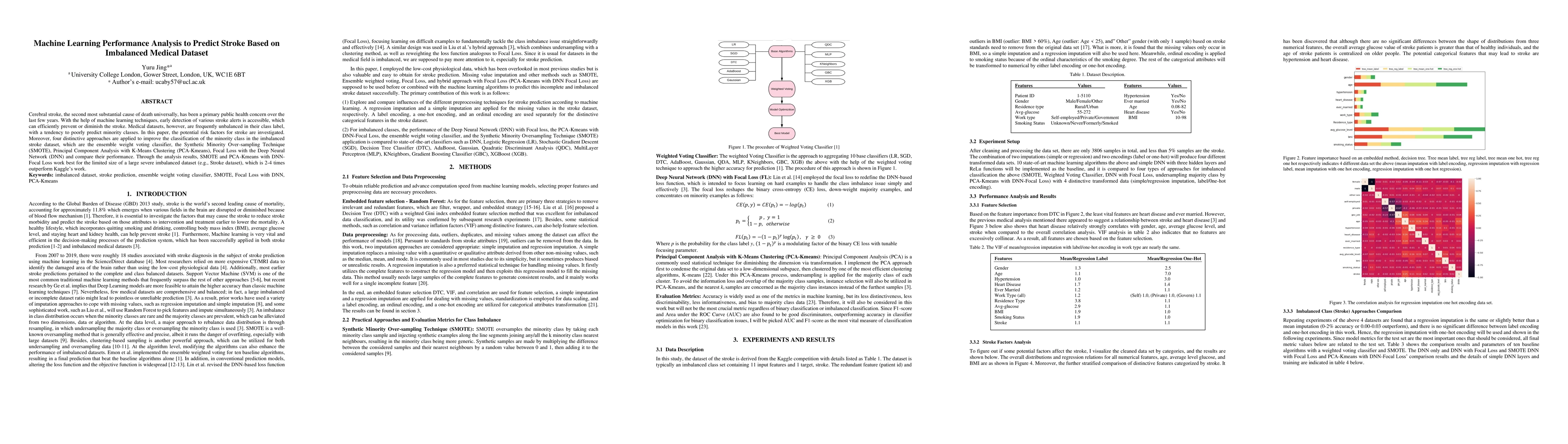 This paper explores machine learning techniques to predict stroke using imbalanced medical datasets, focusing on improving minority class classification. It evaluates four methods: ensemble weight voting, SMOTE, PCA-Kmeans, and DNN with Focal Loss, finding SMOTE and PCA-Kmeans with DNN-Focal Loss outperform others for severe imbalance, achieving 2-4 times better results than existing approaches.