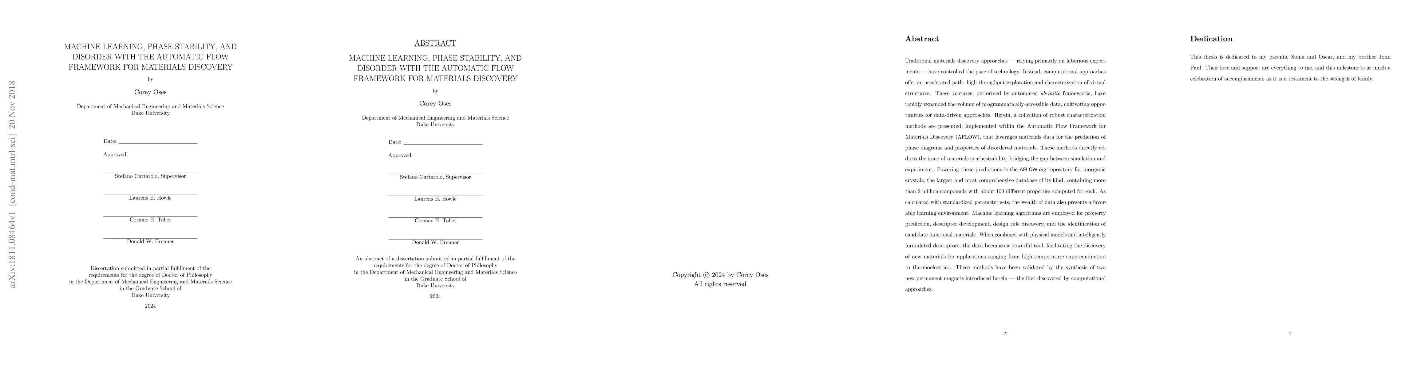 This paper presents machine learning techniques within the Automatic Flow Framework for Materials Discovery (AFLOW) that predict phase diagrams and properties of disordered materials, bridging computational and experimental gaps. Using the extensive AFLOW.org database, it employs machine learning for property prediction, material design, and discovery, exemplified by the synthesis of two new permanent magnets.
