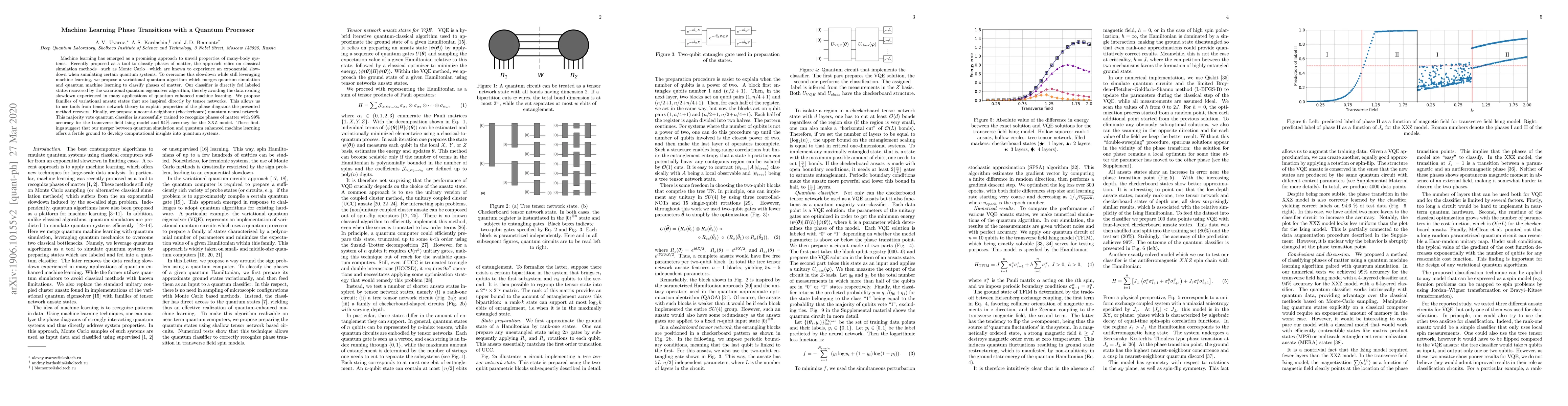 Machine learning has emerged as a promising approach to study the properties of many-body systems. Recently proposed as a tool to classify phases of matter, the approach relies on classical simulation methods$-$such as Monte Carlo$-$which are known to experience an exponential slowdown when simulating certain quantum systems. To overcome this slowdown while still leveraging machine learning, we propose a variational quantum algorithm which merges quantum simulation and quantum machine learning to classify phases of matter. Our classifier is directly fed labeled states recovered by the variational quantum eigensolver algorithm, thereby avoiding the data reading slowdown experienced in many applications of quantum enhanced machine learning. We propose families of variational ansatz states that are inspired directly by tensor networks. This allows us to use tools from tensor network theory to explain properties of the phase diagrams the presented method recovers. Finally, we propose a nearest-neighbour (checkerboard) quantum neural network. This majority vote quantum classifier is successfully trained to recognize phases of matter with $99\%$ accuracy for the transverse field Ising model and $94\%$ accuracy for the XXZ model. These findings suggest that our merger between quantum simulation and quantum enhanced machine learning offers a fertile ground to develop computational insights into quantum systems.