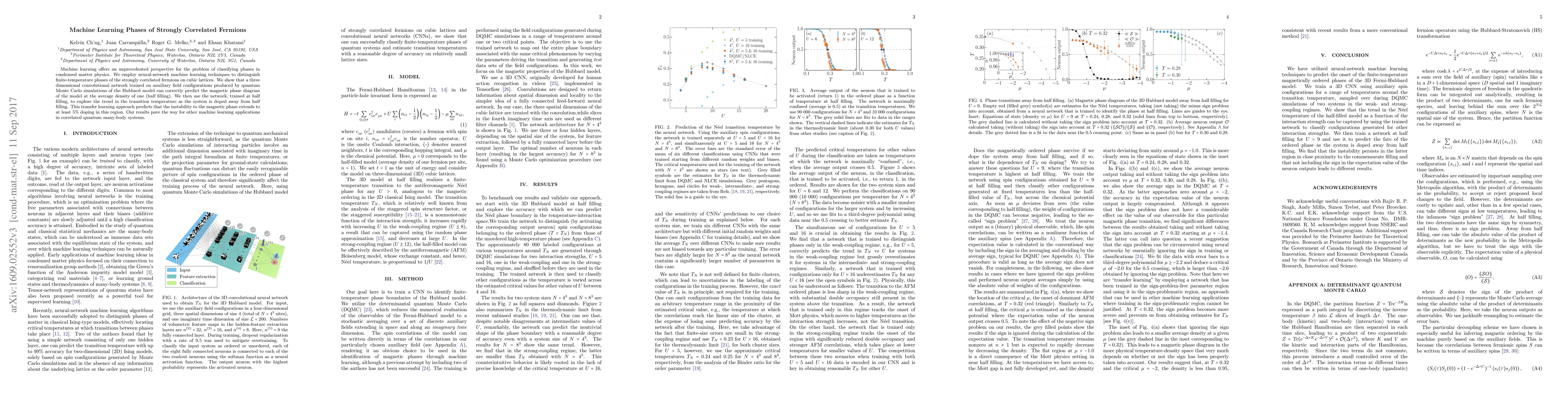 Machine learning offers an unprecedented perspective for the problem of classifying phases in condensed matter physics. We employ neural-network machine learning techniques to distinguish finite-temperature phases of the strongly correlated fermions on cubic lattices. We show that a three dimensional convolutional network trained on auxiliary field configurations produced by quantum Monte Carlo simulations of the Hubbard model can correctly predict the magnetic phase diagram of the model at the average density of one (half filling). We then use the network, trained at half filling, to explore the trend in the transition temperature as the system is doped away from half filling. This transfer learning approach predicts that the instability to the magnetic phase extends to at least 5% doping in this region. Our results pave the way for other machine learning applications in correlated quantum many-body systems.