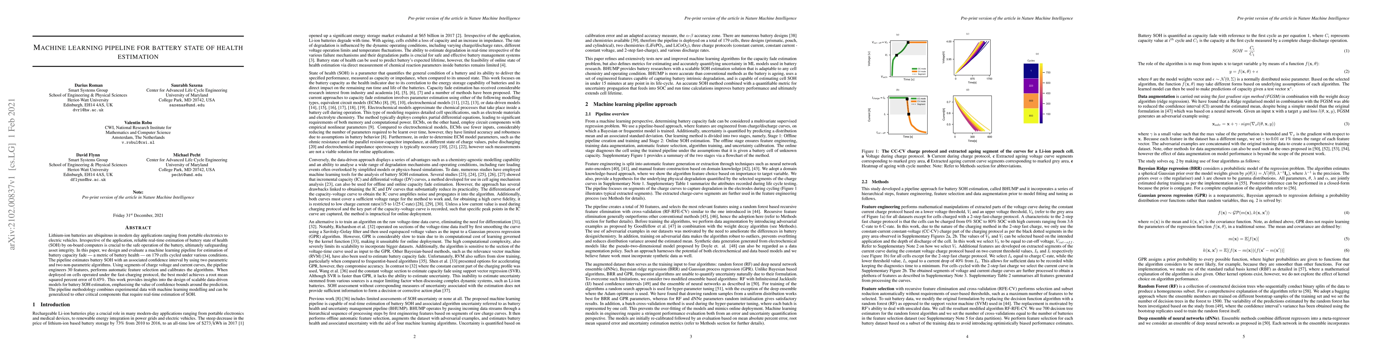 Lithium-ion batteries are ubiquitous in modern day applications ranging from portable electronics to electric vehicles. Irrespective of the application, reliable real-time estimation of battery state of health (SOH) by on-board computers is crucial to the safe operation of the battery, ultimately safeguarding asset integrity. In this paper, we design and evaluate a machine learning pipeline for estimation of battery capacity fade - a metric of battery health - on 179 cells cycled under various conditions. The pipeline estimates battery SOH with an associated confidence interval by using two parametric and two non-parametric algorithms. Using segments of charge voltage and current curves, the pipeline engineers 30 features, performs automatic feature selection and calibrates the algorithms. When deployed on cells operated under the fast-charging protocol, the best model achieves a root mean squared percent error of 0.45\%. This work provides insights into the design of scalable data-driven models for battery SOH estimation, emphasising the value of confidence bounds around the prediction. The pipeline methodology combines experimental data with machine learning modelling and can be generalized to other critical components that require real-time estimation of SOH.