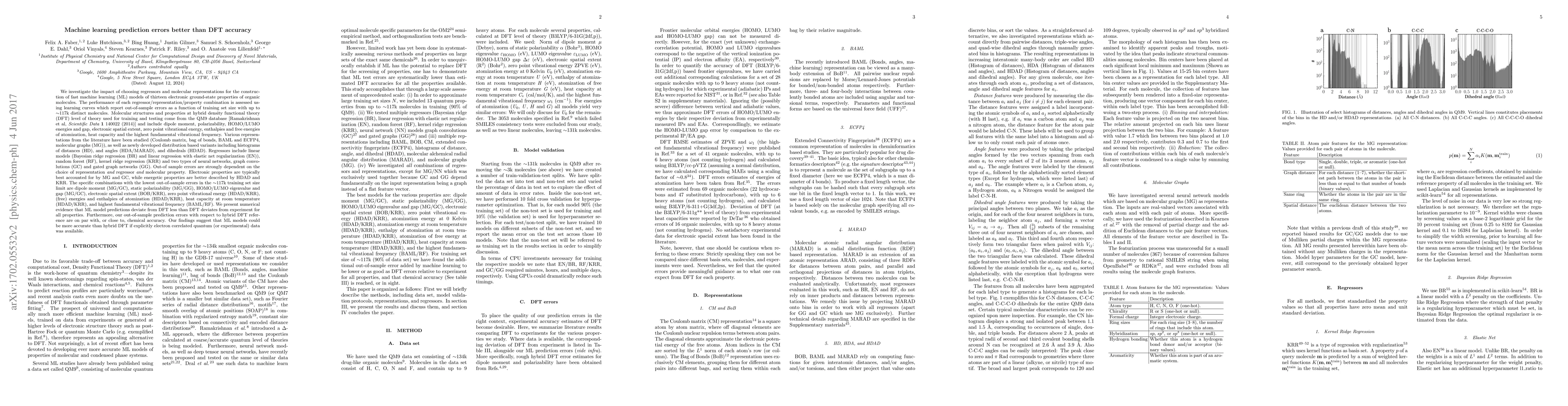 We investigate the impact of choosing regressors and molecular representations for the construction of fast machine learning (ML) models of thirteen electronic ground-state properties of organic molecules. The performance of each regressor/representation/property combination is assessed using learning curves which report out-of-sample errors as a function of training set size with up to $\sim$117k distinct molecules. Molecular structures and properties at hybrid density functional theory (DFT) level of theory used for training and testing come from the QM9 database [Ramakrishnan et al, {\em Scientific Data} {\bf 1} 140022 (2014)] and include dipole moment, polarizability, HOMO/LUMO energies and gap, electronic spatial extent, zero point vibrational energy, enthalpies and free energies of atomization, heat capacity and the highest fundamental vibrational frequency. Various representations from the literature have been studied (Coulomb matrix, bag of bonds, BAML and ECFP4, molecular graphs (MG)), as well as newly developed distribution based variants including histograms of distances (HD), and angles (HDA/MARAD), and dihedrals (HDAD). Regressors include linear models (Bayesian ridge regression (BR) and linear regression with elastic net regularization (EN)), random forest (RF), kernel ridge regression (KRR) and two types of neural net works, graph convolutions (GC) and gated graph networks (GG). We present numerical evidence that ML model predictions deviate from DFT less than DFT deviates from experiment for all properties. Furthermore, our out-of-sample prediction errors with respect to hybrid DFT reference are on par with, or close to, chemical accuracy. Our findings suggest that ML models could be more accurate than hybrid DFT if explicitly electron correlated quantum (or experimental) data was available.