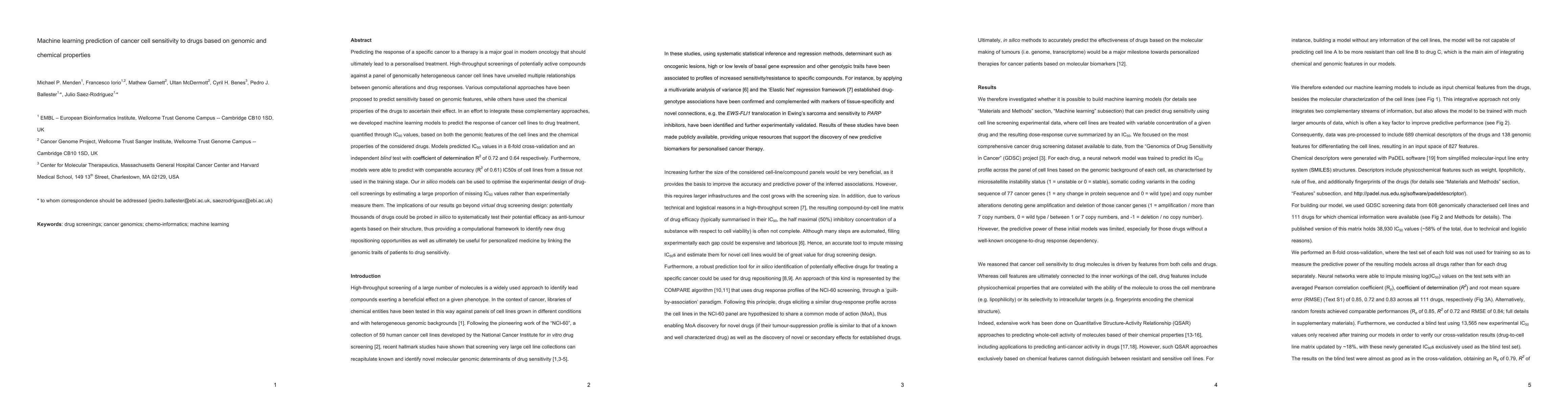 This research develops machine learning models to predict cancer cell sensitivity to drugs using both genomic features and chemical properties of drugs. The models achieved high predictive accuracy (R2 of 0.72 in cross-validation and 0.64 in blind tests) and can estimate missing IC50 values, aiding in optimizing drug screening and potentially identifying new drug candidates for personalized medicine.