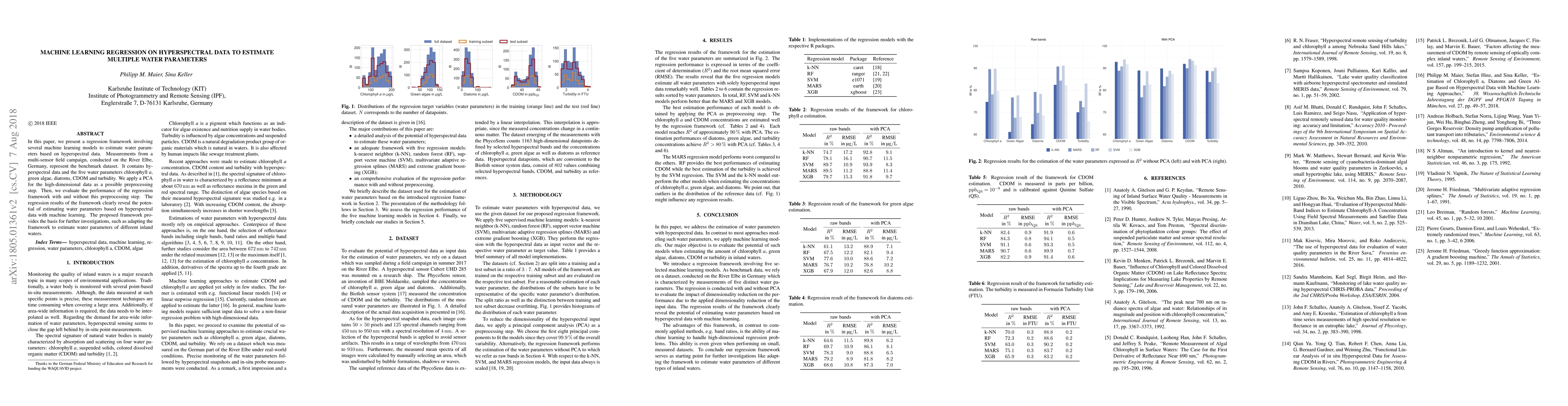 This paper develops a machine learning regression framework to estimate multiple water parameters—chlorophyll a, green algae, diatoms, CDOM, and turbidity—using hyperspectral data from the River Elbe. The study evaluates the performance of various regression models with and without PCA preprocessing, demonstrating the potential of hyperspectral data in water parameter estimation.