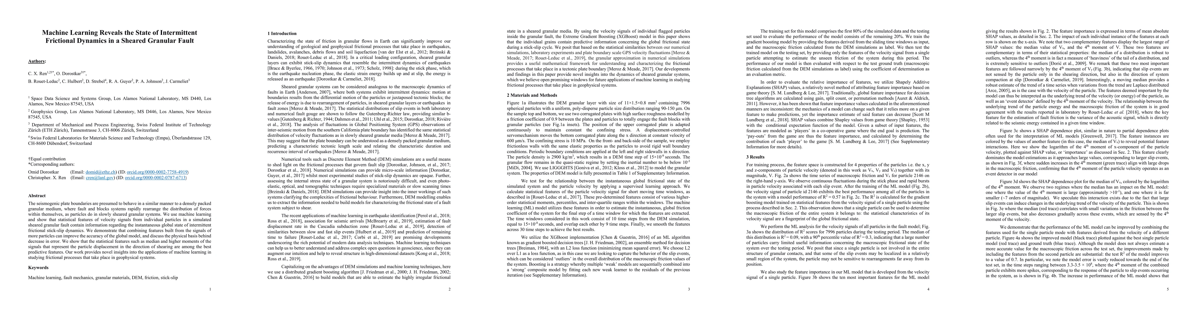 This paper uses machine learning to analyze velocity signals from particles in a simulated sheared granular fault, revealing statistical features that predict intermittent frictional dynamics. Combining features from multiple particles enhances the accuracy of the global model, highlighting the potential of machine learning in geophysical frictional studies.