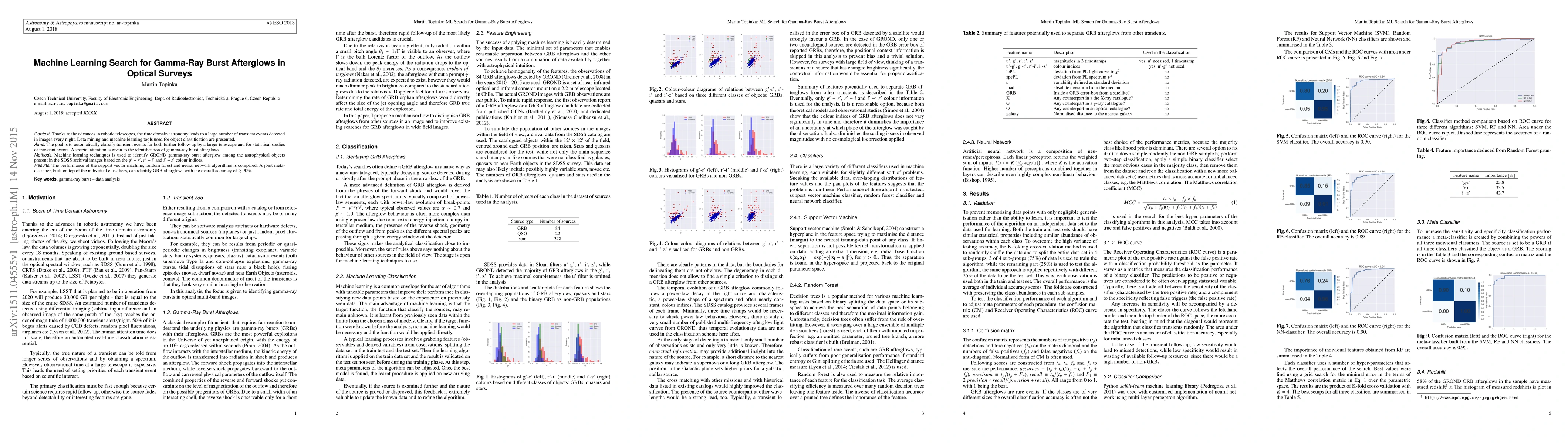 This paper explores machine learning techniques to classify transient events detected by robotic telescopes, focusing on identifying gamma-ray burst afterglows in optical surveys. The study compares support vector machines, random forests, and neural networks, achieving an overall accuracy of over 90% using a joint meta-classifier.