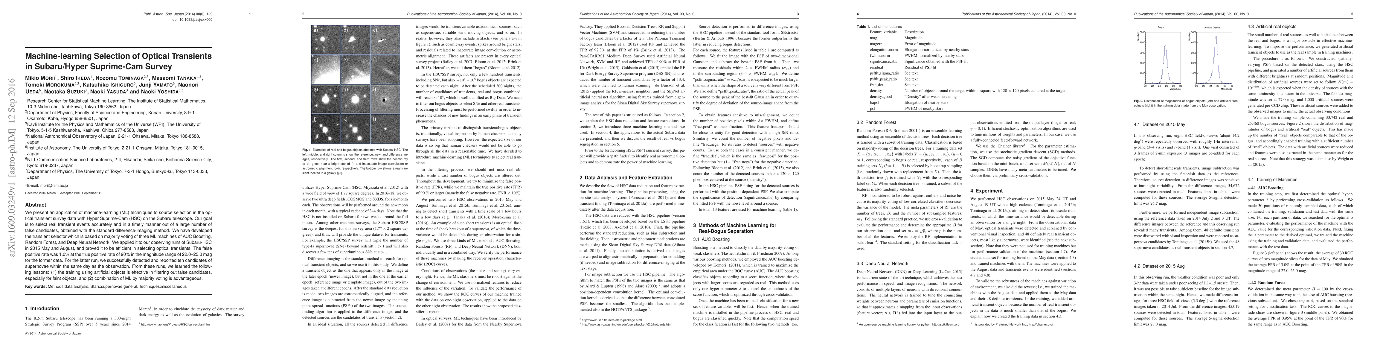 This paper applies machine-learning techniques to select optical transients from Subaru/Hyper Suprime-Cam survey data, employing a transient selector based on AUC Boosting, Random Forest, and Deep Neural Network. The method proved efficient with a 1.0% false positive rate and 90% true positive rate, successfully detecting supernovae within a day of observation.