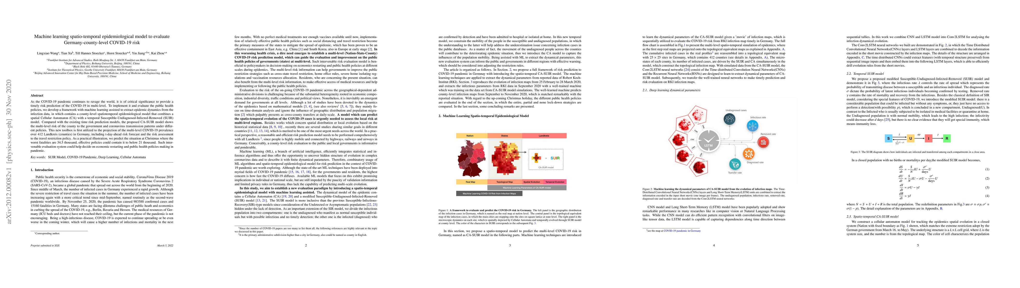 As the COVID-19 pandemic continues to ravage the world, it is of critical significance to provide a timely risk prediction of the COVID-19 in multi-level. To implement it and evaluate the public health policies, we develop a framework with machine learning assisted to extract epidemic dynamics from the infection data, in which contains a county-level spatiotemporal epidemiological model that combines a spatial Cellular Automaton (CA) with a temporal Susceptible-Undiagnosed-Infected-Removed (SUIR) model. Compared with the existing time risk prediction models, the proposed CA-SUIR model shows the multi-level risk of the county to the government and coronavirus transmission patterns under different policies. This new toolbox is first utilized to the projection of the multi-level COVID-19 prevalence over 412 Landkreis (counties) in Germany, including t-day-ahead risk forecast and the risk assessment to the travel restriction policy. As a practical illustration, we predict the situation at Christmas where the worst fatalities are 34.5 thousand, effective policies could contain it to below 21 thousand. Such intervenable evaluation system could help decide on economic restarting and public health policies making in pandemic.