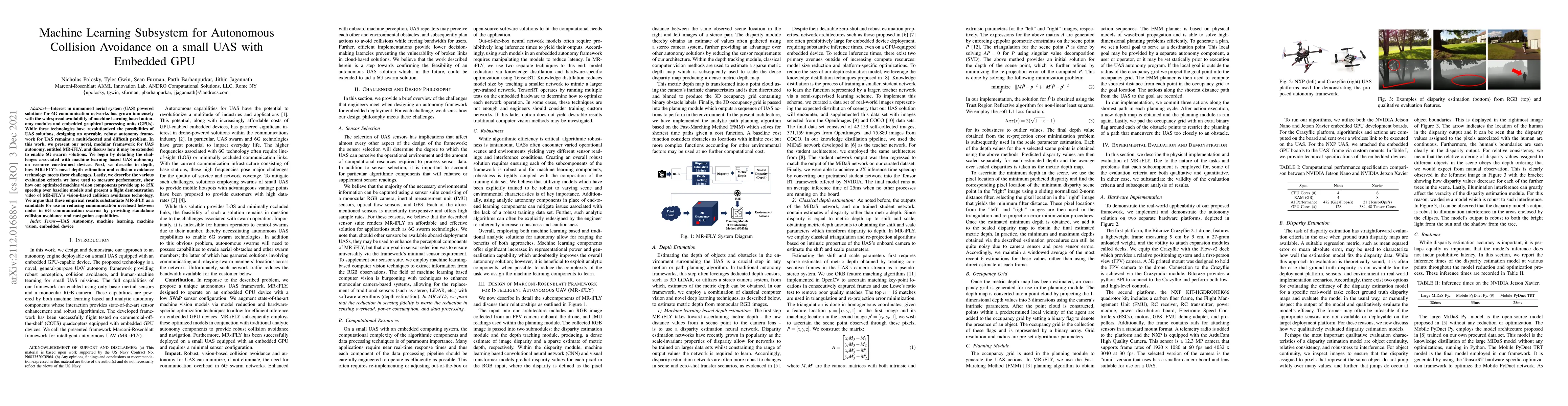 This paper introduces MR-iFLY, a modular machine learning framework for autonomous collision avoidance on small unmanned aerial systems (UAS) equipped with embedded GPUs. The framework optimizes depth estimation and collision avoidance on resource-constrained devices, demonstrating a 15X speedup over baseline models and potential for reducing communication overhead in 6G swarm solutions.
