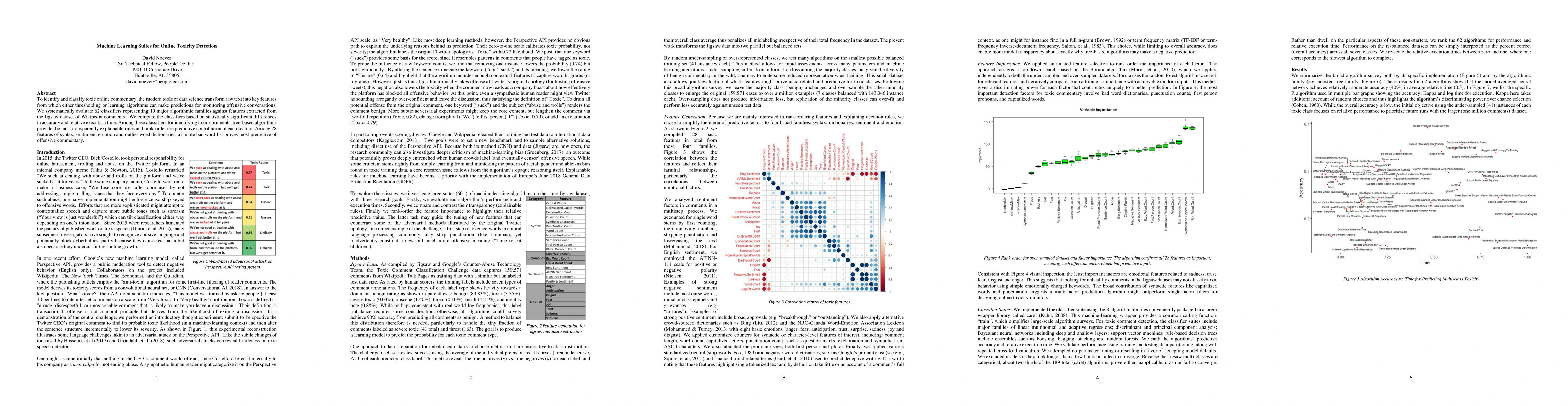 This research evaluates 62 classifiers for detecting toxic online comments using the Jigsaw dataset. It finds that tree-based algorithms are most transparent and that simple bad word lists are most predictive of offensive commentary.
