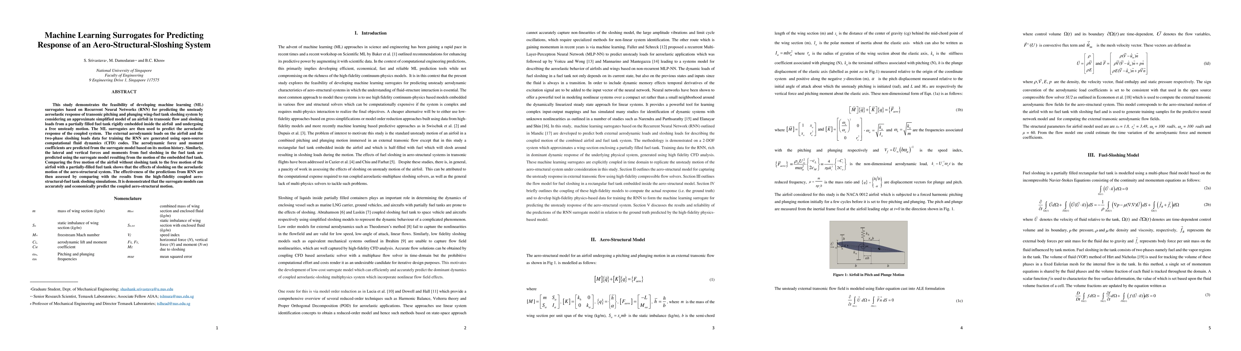 This study demonstrates the feasibility of developing machine learning (ML) surrogates based on Recurrent Neural Networks (RNN) for predicting the unsteady aeroelastic response of transonic pitching and plunging wing-fuel tank sloshing system by considering an approximate simplified model of an airfoil in transonic flow and sloshing loads from a partially filled fuel tank rigidly embedded inside the airfoil and undergoing a free unsteady motion. The ML surrogates are then used to predict the aeroelastic response of the coupled system. The external aerodynamic loads on the airfoil and the two-phase sloshing loads data for training the RNN are generated using open-source computational fluid dynamics (CFD) codes. The aerodynamic force and moment coefficients are predicted from the surrogate model based on its motion history. Similarly, the lateral and vertical forces and moments from fuel sloshing in the fuel tank are predicted using the surrogate model resulting from the motion of the embedded fuel tank. Comparing the free motion of the airfoil without sloshing tank to the free motion of the airfoil with a partially-filled fuel tank shows that the effects of sloshing on the aeroelastic motion of the aero-structural system. The effectiveness of the predictions from RNN are then assessed by comparing with the results from the high-fidelity coupled aero-structural-fuel tank sloshing simulations. It is demonstrated that the surrogate models can accurately and economically predict the coupled aero-structural motion.