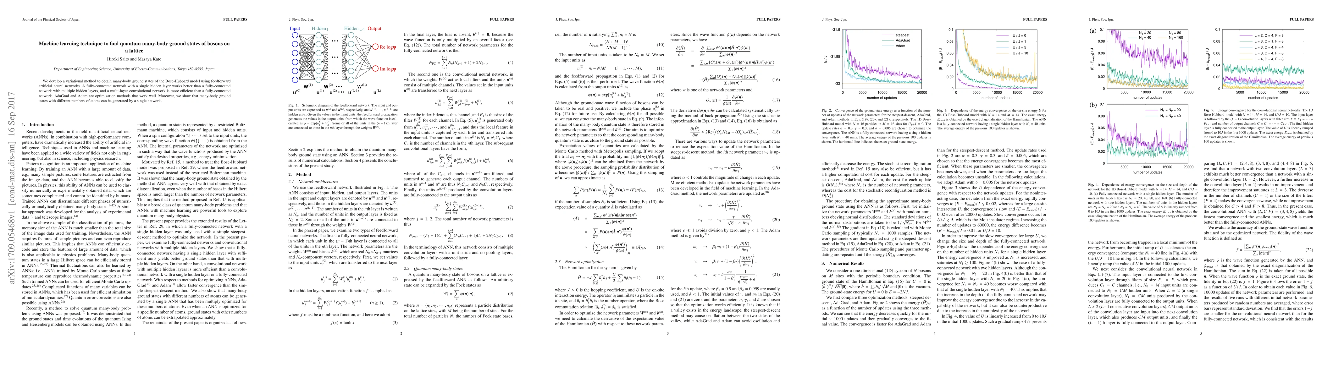Summary: This paper introduces a variational method using feedforward neural networks to find the ground states of the Bose-Hubbard model, demonstrating that a single-layer network outperforms multi-layer ones, while convolutional networks are more efficient. Optimization methods like AdaGrad and Adam are effective, and a single network can generate ground states for different atom numbers.
