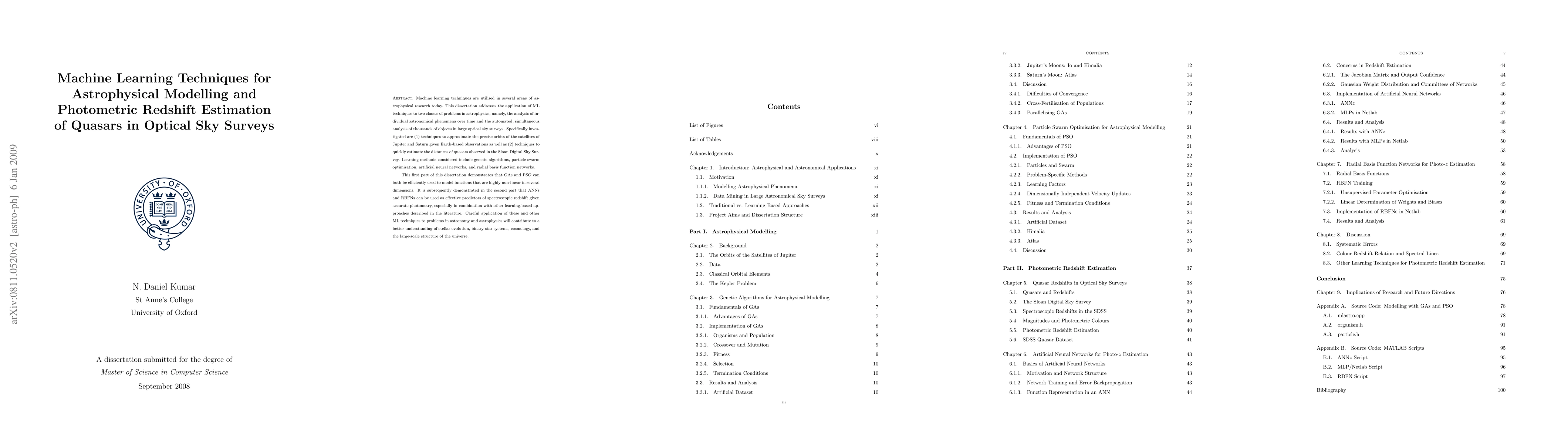 Machine learning techniques are utilised in several areas of astrophysical research today. This dissertation addresses the application of ML techniques to two classes of problems in astrophysics, namely, the analysis of individual astronomical phenomena over time and the automated, simultaneous analysis of thousands of objects in large optical sky surveys. Specifically investigated are (1) techniques to approximate the precise orbits of the satellites of Jupiter and Saturn given Earth-based observations as well as (2) techniques to quickly estimate the distances of quasars observed in the Sloan Digital Sky Survey. Learning methods considered include genetic algorithms, particle swarm optimisation, artificial neural networks, and radial basis function networks. The first part of this dissertation demonstrates that GAs and PSO can both be efficiently used to model functions that are highly non-linear in several dimensions. It is subsequently demonstrated in the second part that ANNs and RBFNs can be used as effective predictors of spectroscopic redshift given accurate photometry, especially in combination with other learning-based approaches described in the literature. Careful application of these and other ML techniques to problems in astronomy and astrophysics will contribute to a better understanding of stellar evolution, binary star systems, cosmology, and the large-scale structure of the universe.