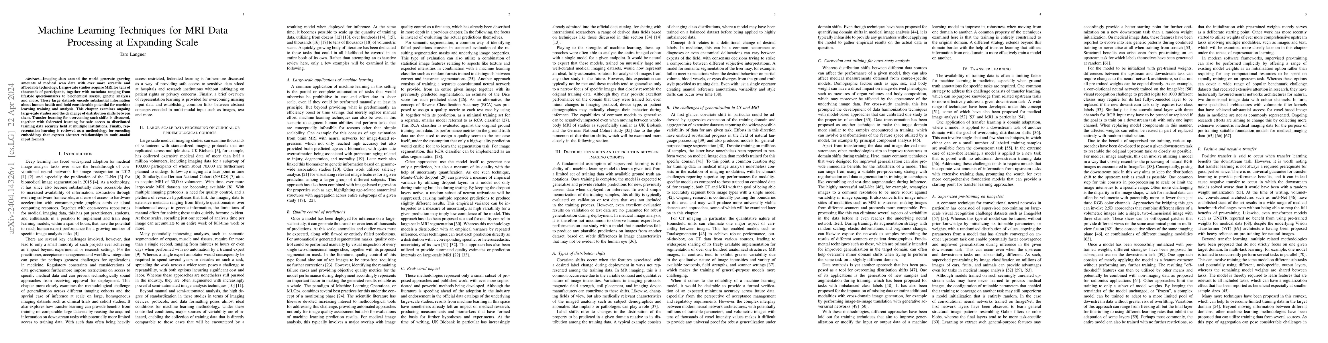 This paper explores machine learning techniques for processing large-scale MRI data from global studies, emphasizing the challenges of distribution shifts and the use of transfer learning, federated learning, and representation learning to harness the potential of these extensive datasets for health insights.