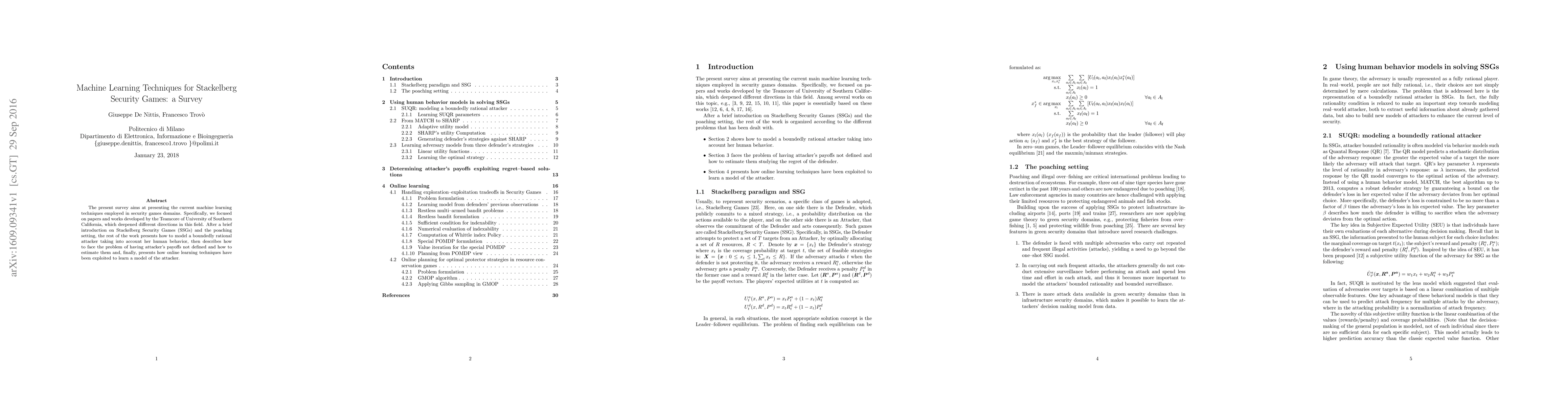 This survey explores machine learning techniques applied to Stackelberg Security Games, focusing on works by the University of Southern California's Teamcore. It discusses modeling boundedly rational attackers, estimating undefined payoffs, and employing online learning to develop attacker models.