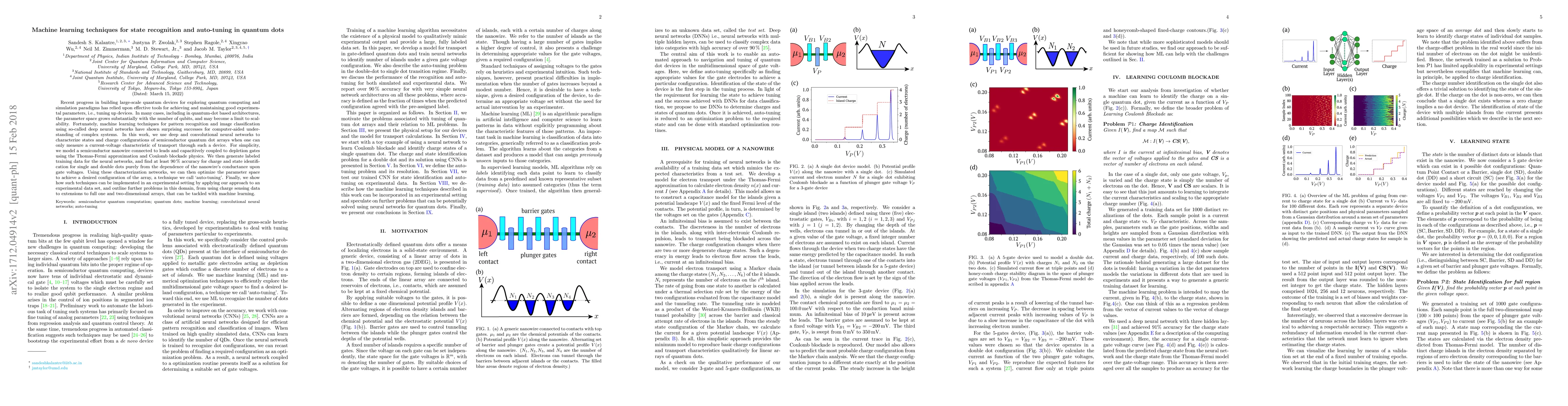 This paper explores the use of deep and convolutional neural networks for recognizing states and charge configurations in quantum dot arrays, achieving over 90% accuracy based on conductance measurements. The study also introduces an auto-tuning technique to optimize device parameters, demonstrating its potential for scalability and practical implementation in quantum computing experiments.