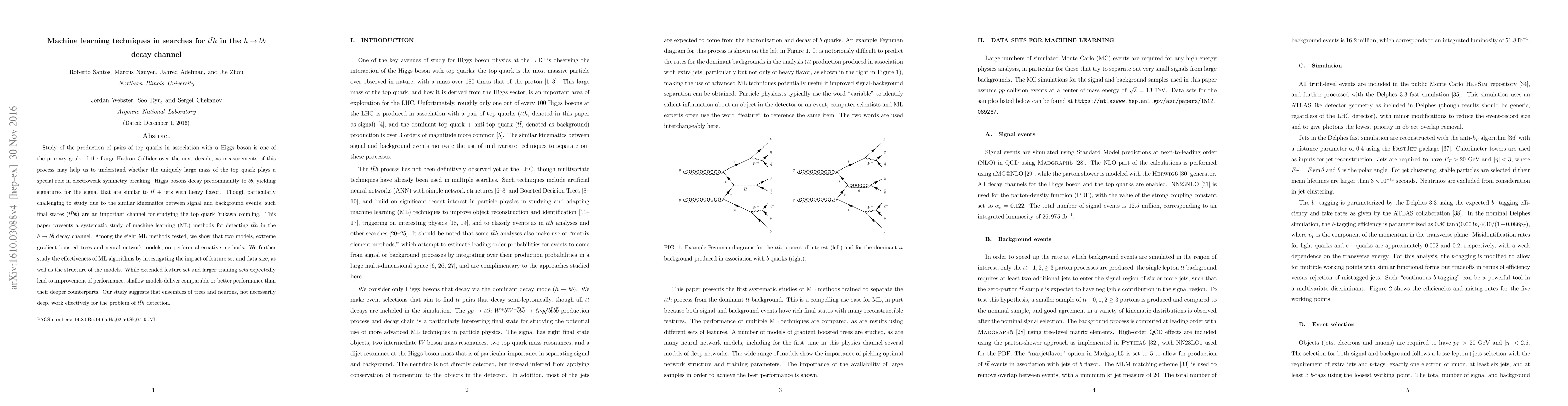 This paper explores machine learning techniques for detecting $t\bar{t}h$ pairs in the $h \rightarrow b\bar{b}$ decay channel, finding that extreme gradient boosted trees and neural networks outperform other methods. The study highlights that simpler models can achieve comparable performance to deeper ones, suggesting effective detection can be achieved with ensembles of shallow trees and neurons.
