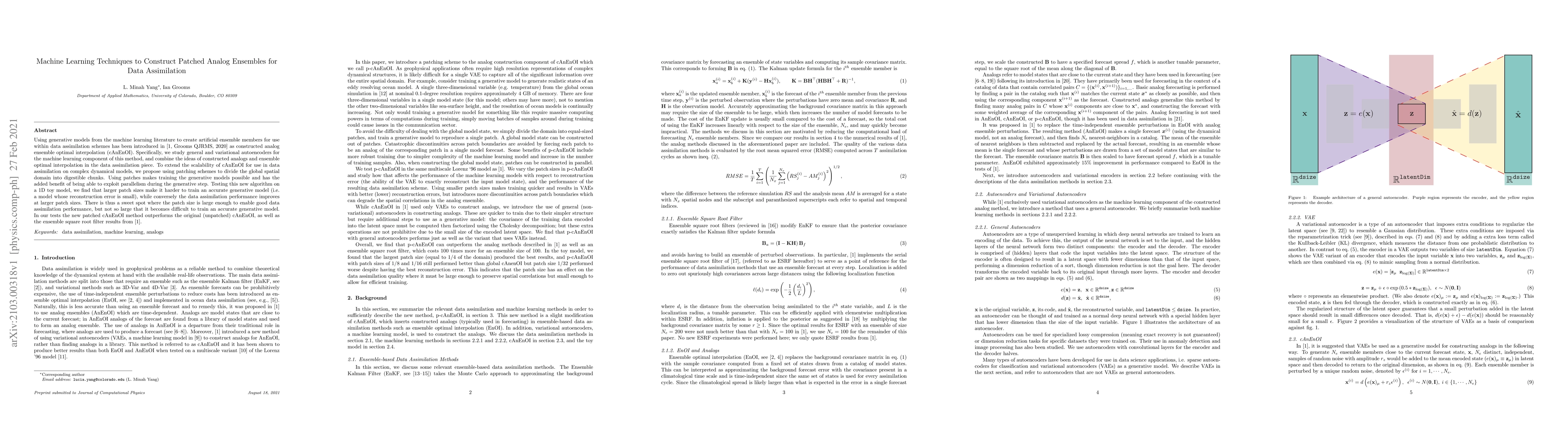 This paper proposes a patched version of constructed analog ensemble optimal interpolation (cAnEnOI) using machine learning techniques to enhance data assimilation. The study finds that while larger patch sizes improve data assimilation performance, they also make training more challenging; thus, an optimal patch size exists for balancing these factors. The patched cAnEnOI method outperforms both the original cAnEnOI and ensemble square root filter methods.