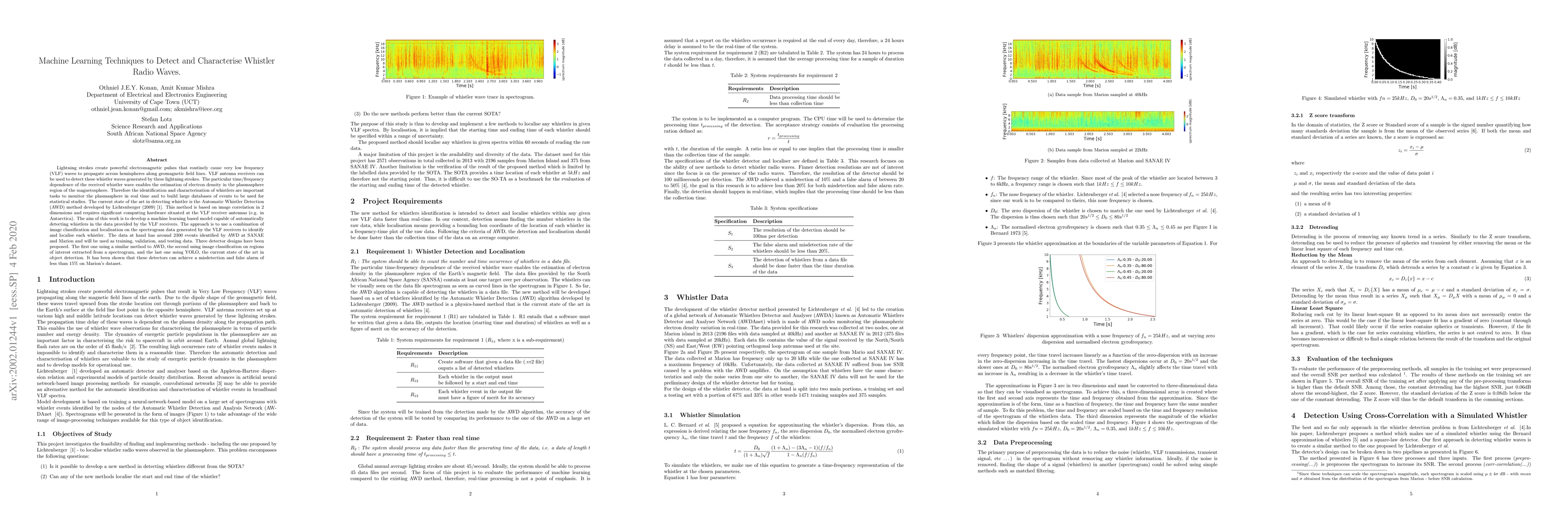 Lightning strokes create powerful electromagnetic pulses that routinely cause very low frequency (VLF) waves to propagate across hemispheres along geomagnetic field lines. VLF antenna receivers can be used to detect these whistler waves generated by these lightning strokes. The particular time/frequency dependence of the received whistler wave enables the estimation of electron density in the plasmasphere region of the magnetosphere. Therefore the identification and characterisation of whistlers are important tasks to monitor the plasmasphere in real-time and to build large databases of events to be used for statistical studies. The current state of the art in detecting whistler is the Automatic Whistler Detection (AWD) method developed by Lichtenberger (2009). This method is based on image correlation in 2 dimensions and requires significant computing hardware situated at the VLF receiver antennas (e.g. in Antarctica). The aim of this work is to develop a machine learning-based model capable of automatically detecting whistlers in the data provided by the VLF receivers. The approach is to use a combination of image classification and localisation on the spectrogram data generated by the VLF receivers to identify and localise each whistler. The data at hand has around 2300 events identified by AWD at SANAE and Marion and will be used as training, validation, and testing data. Three detector designs have been proposed. The first one using a similar method to AWD, the second using image classification on regions of interest extracted from a spectrogram, and the last one using YOLO, the current state of the art in object detection. It has been shown that these detectors can achieve a misdetection and false alarm of less than 15% on Marion's dataset.