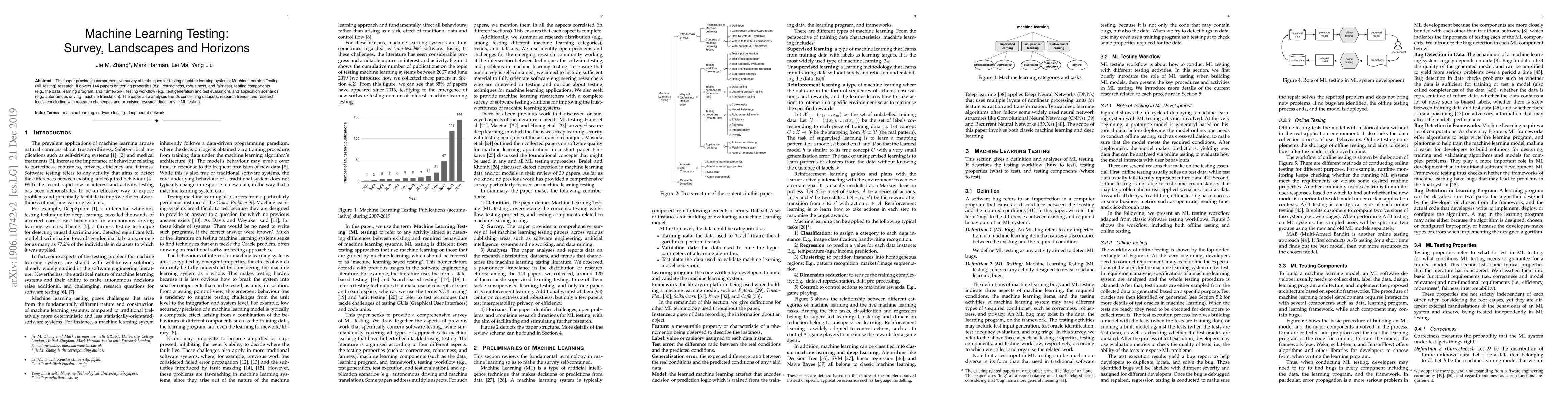 This paper surveys 144 studies on Machine Learning Testing (ML testing), covering testing properties, components, workflows, and applications. It analyzes trends and identifies challenges and future research directions in ML testing.