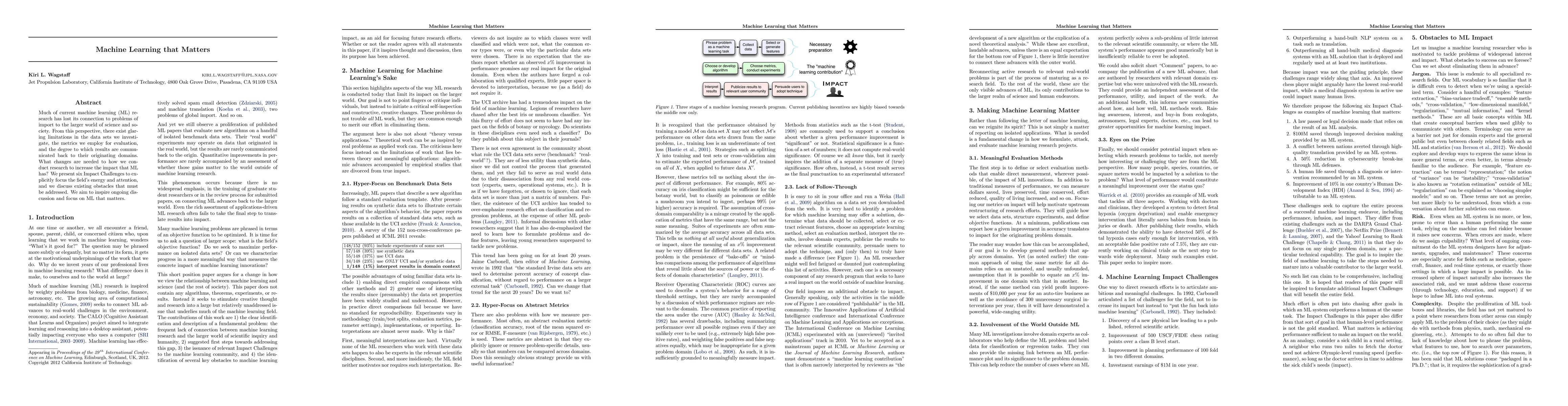 Much of current machine learning (ML) research has lost its connection to problems of import to the larger world of science and society. From this perspective, there exist glaring limitations in the data sets we investigate, the metrics we employ for evaluation, and the degree to which results are communicated back to their originating domains. What changes are needed to how we conduct research to increase the impact that ML has? We present six Impact Challenges to explicitly focus the field?s energy and attention, and we discuss existing obstacles that must be addressed. We aim to inspire ongoing discussion and focus on ML that matters.