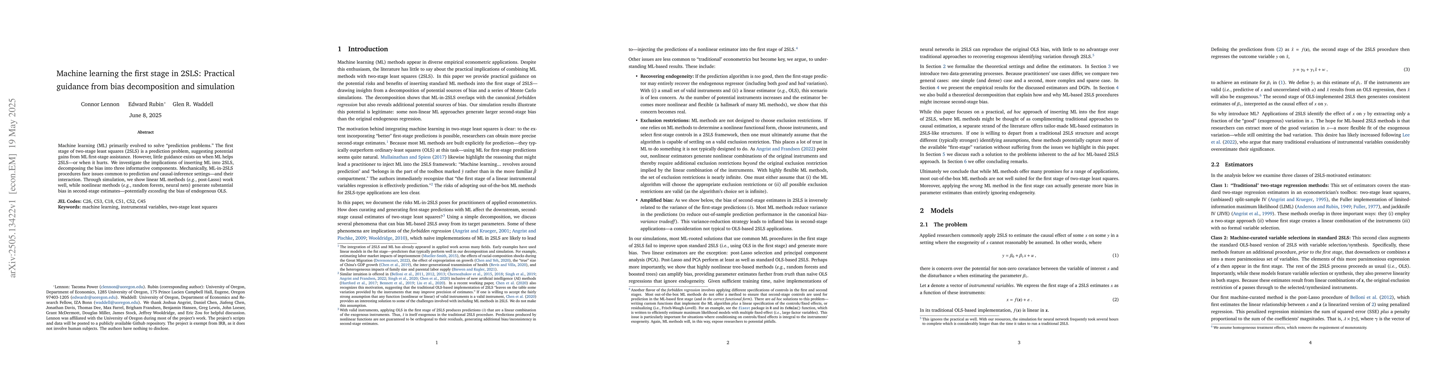 The paper investigates the implications of using machine learning (ML) methods in the first stage of two-stage least squares (2SLS), decomposing bias into three components through simulation and analysis.