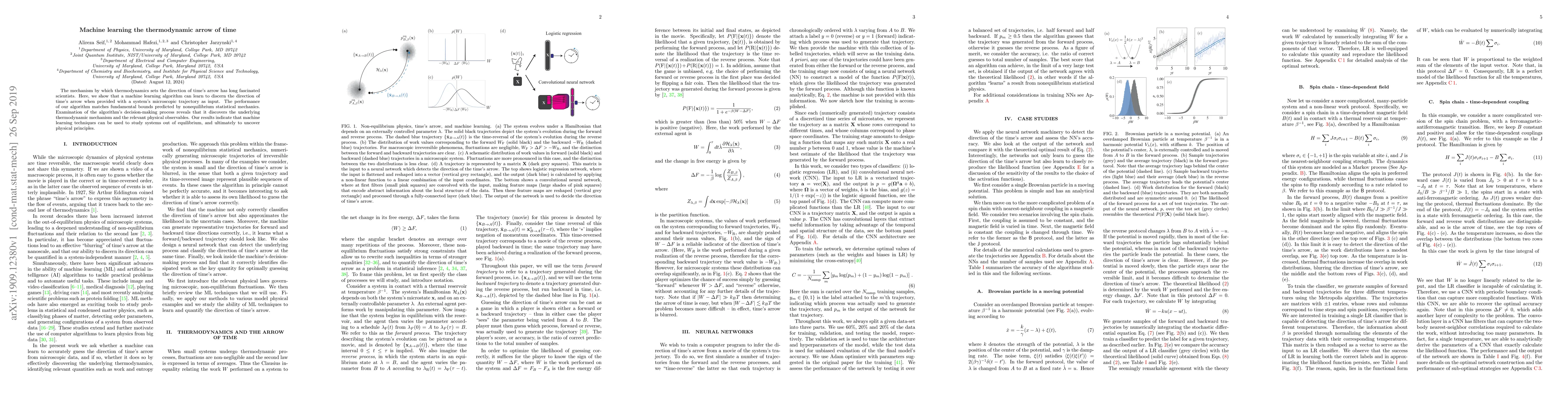 The mechanism by which thermodynamics sets the direction of time's arrow has long fascinated scientists. Here, we show that a machine learning algorithm can learn to discern the direction of time's arrow when provided with a system's microscopic trajectory as input. The performance of our algorithm matches fundamental bounds predicted by nonequilibrium statistical mechanics. Examination of the algorithm's decision-making process reveals that it discovers the underlying thermodynamic mechanism and the relevant physical observables. Our results indicate that machine learning techniques can be used to study systems out of equilibrium, and ultimately to uncover physical principles.