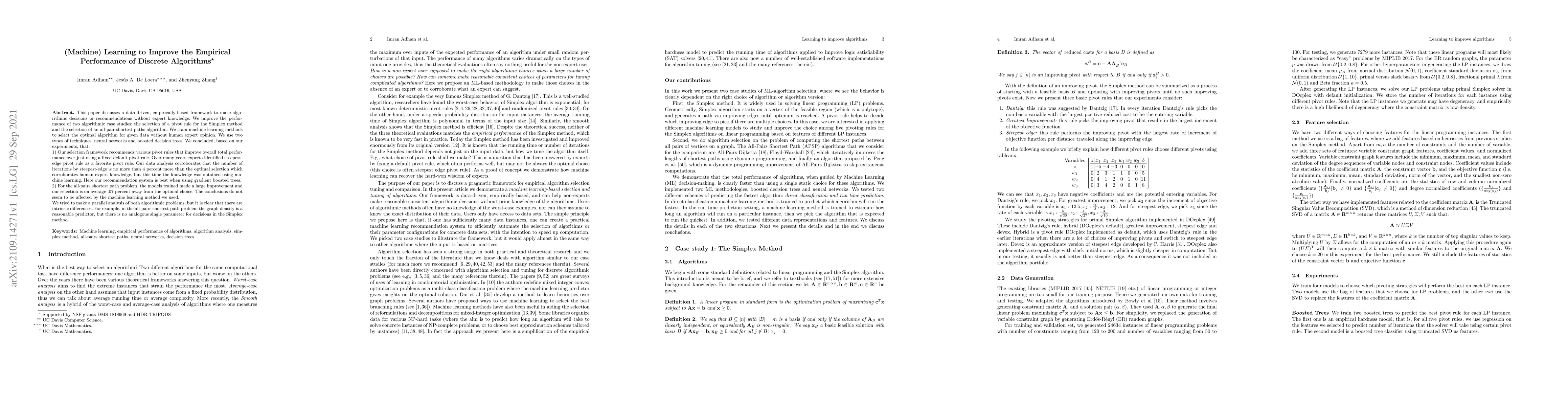 This paper presents a data-driven framework using machine learning to enhance the performance of discrete algorithms, specifically the Simplex method and all-pair shortest paths algorithms. Experiments show that gradient boosted trees outperform fixed pivot rules, and neural networks and boosted decision trees both effectively select optimal algorithms, though with different efficiencies.
