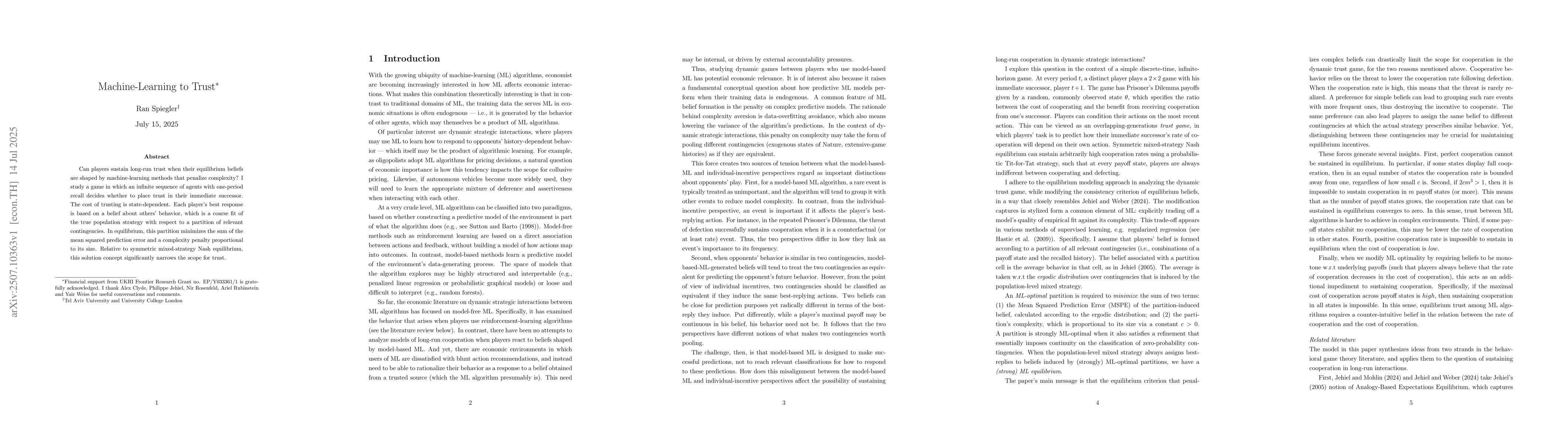 Can players sustain long-run trust when their equilibrium beliefs are shaped by machine-learning methods that penalize complexity? I study a game in which an infinite sequence of agents with one-period recall decides whether to place trust in their immediate successor. The cost of trusting is state-dependent. Each player's best response is based on a belief about others' behavior, which is a coarse fit of the true population strategy with respect to a partition of relevant contingencies. In equilibrium, this partition minimizes the sum of the mean squared prediction error and a complexity penalty proportional to its size. Relative to symmetric mixed-strategy Nash equilibrium, this solution concept significantly narrows the scope for trust.