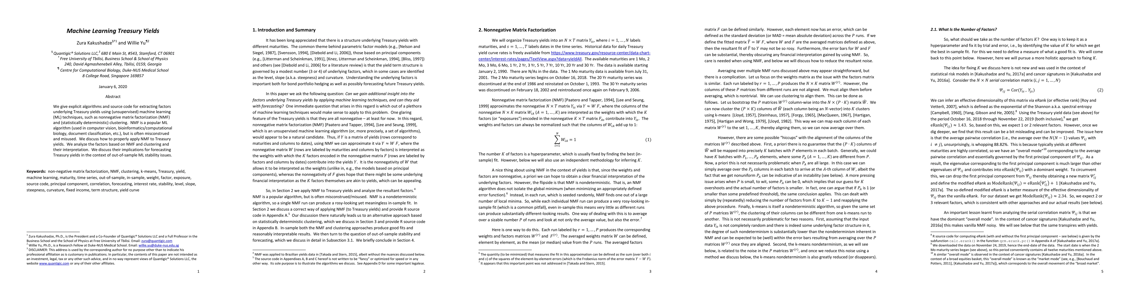 We give explicit algorithms and source code for extracting factors underlying Treasury yields using (unsupervised) machine learning (ML) techniques, such as nonnegative matrix factorization (NMF) and (statistically deterministic) clustering. NMF is a popular ML algorithm (used in computer vision, bioinformatics/computational biology, document classification, etc.), but is often misconstrued and misused. We discuss how to properly apply NMF to Treasury yields. We analyze the factors based on NMF and clustering and their interpretation. We discuss their implications for forecasting Treasury yields in the context of out-of-sample ML stability issues.