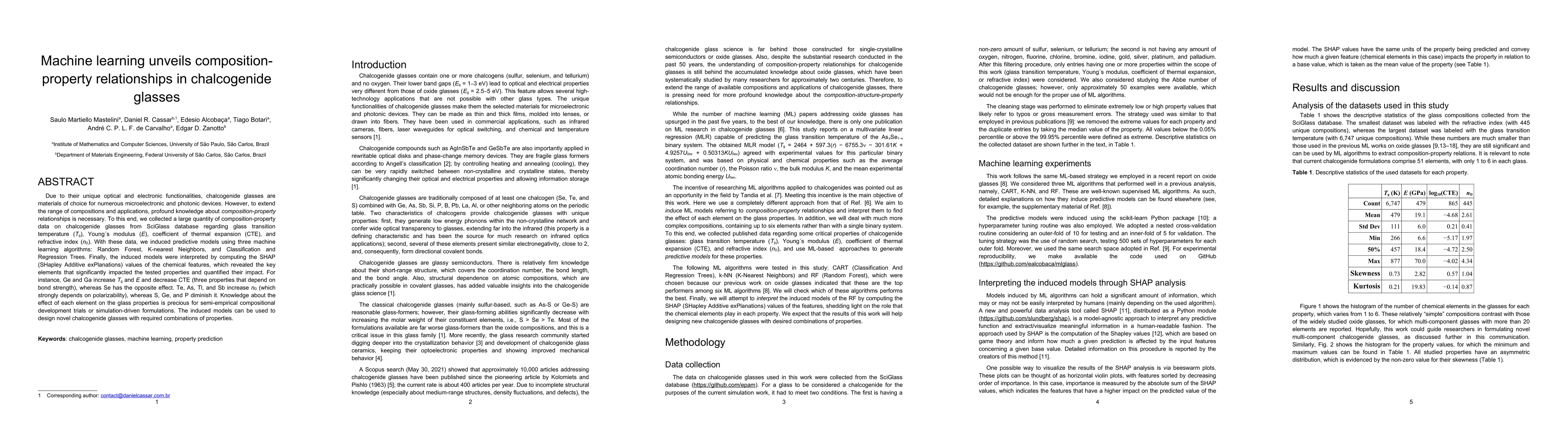 This paper uses machine learning to uncover composition-property relationships in chalcogenide glasses, revealing key elements like Ge and Ga that increase glass transition temperature and Young's modulus, while Se has the opposite effect. The models can guide the design of novel glasses with desired properties.