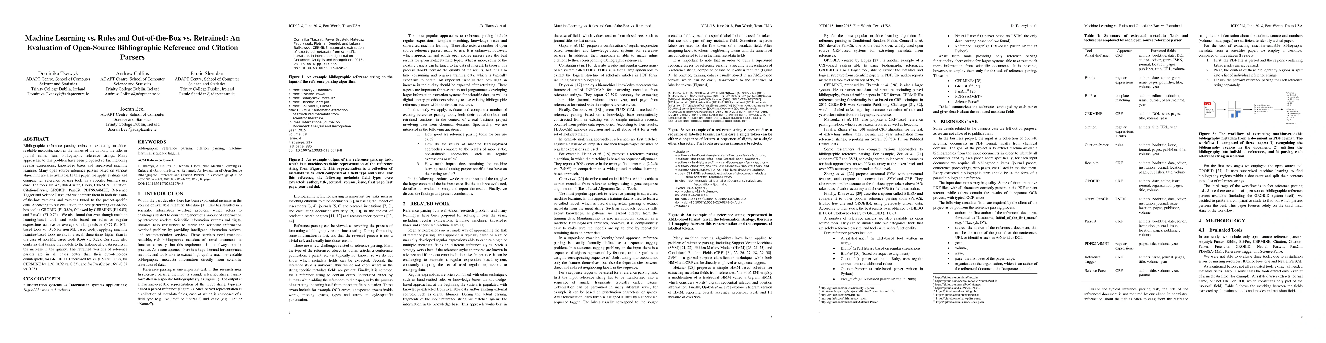 Open-source bibliographic reference parsers were evaluated for their performance in extracting metadata from references. Machine learning-based tools outperformed rule-based and regular expression approaches, with retrained versions showing significant improvements in accuracy.