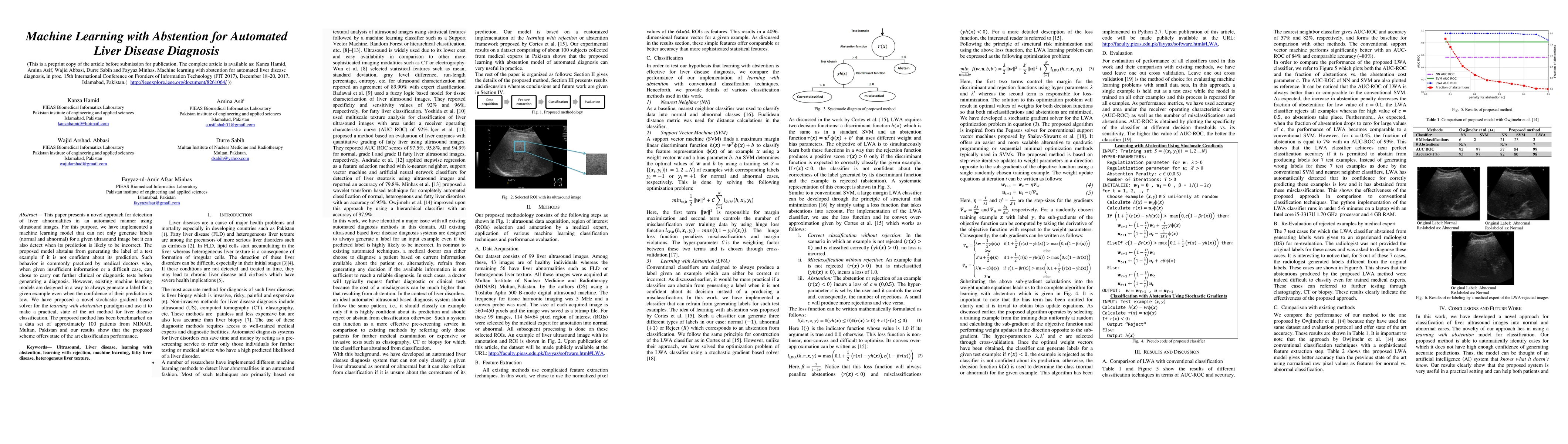 This paper presents a novel approach for detection of liver abnormalities in an automated manner using ultrasound images. For this purpose, we have implemented a machine learning model that can not only generate labels (normal and abnormal) for a given ultrasound image but it can also detect when its prediction is likely to be incorrect. The proposed model abstains from generating the label of a test example if it is not confident about its prediction. Such behavior is commonly practiced by medical doctors who, when given insufficient information or a difficult case, can chose to carry out further clinical or diagnostic tests before generating a diagnosis. However, existing machine learning models are designed in a way to always generate a label for a given example even when the confidence of their prediction is low. We have proposed a novel stochastic gradient based solver for the learning with abstention paradigm and use it to make a practical, state of the art method for liver disease classification. The proposed method has been benchmarked on a data set of approximately 100 patients from MINAR, Multan, Pakistan and our results show that the proposed scheme offers state of the art classification performance.