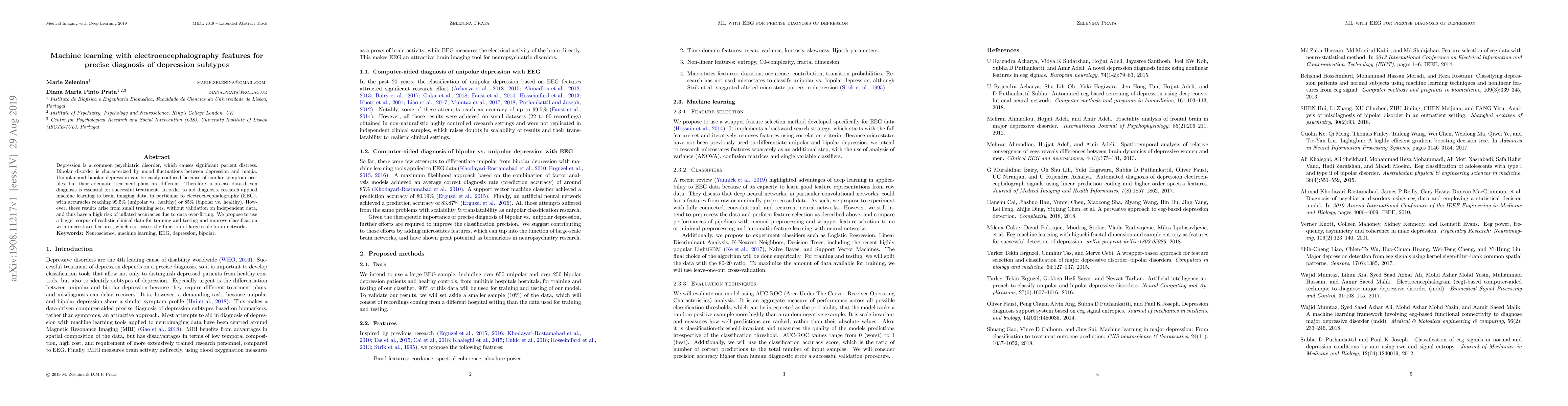 This paper explores the use of machine learning and EEG features to accurately diagnose subtypes of depression, aiming to differentiate between unipolar and bipolar depression for better treatment. The authors propose using a larger, more realistic clinical dataset and microstates features to improve classification accuracy and reduce overfitting risks.