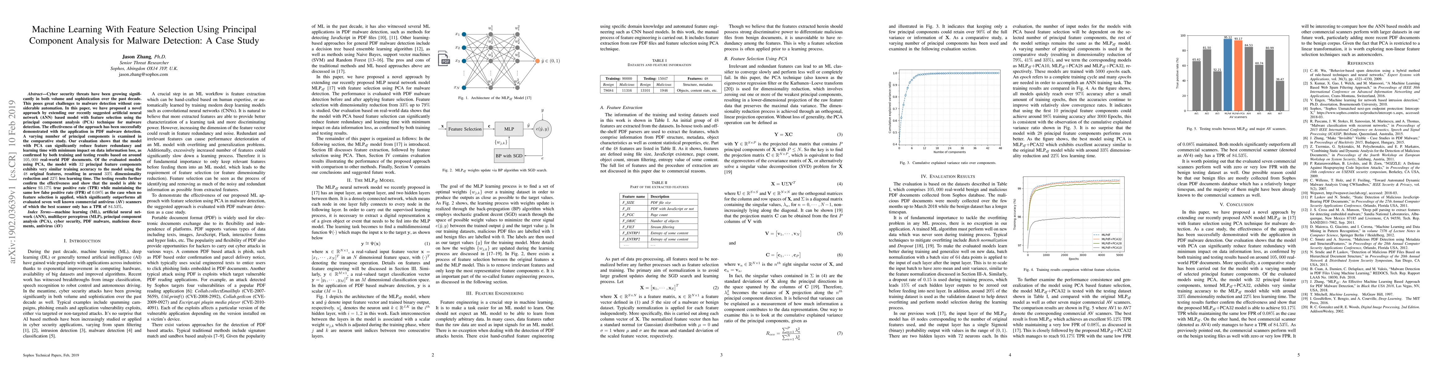 Cyber security threats have been growing significantly in both volume and sophistication over the past decade. This poses great challenges to malware detection without considerable automation. In this paper, we have proposed a novel approach by extending our recently suggested artificial neural network (ANN) based model with feature selection using the principal component analysis (PCA) technique for malware detection. The effectiveness of the approach has been successfully demonstrated with the application in PDF malware detection. A varying number of principal components is examined in the comparative study. Our evaluation shows that the model with PCA can significantly reduce feature redundancy and learning time with minimum impact on data information loss, as confirmed by both training and testing results based on around 105,000 real-world PDF documents. Of the evaluated models using PCA, the model with 32 principal feature components exhibits very similar training accuracy to the model using the 48 original features, resulting in around 33% dimensionality reduction and 22% less learning time. The testing results further confirm the effectiveness and show that the model is able to achieve 93.17% true positive rate (TPR) while maintaining the same low false positive rate (FPR) of 0.08% as the case when no feature selection is applied, which significantly outperforms all evaluated seven well known commercial antivirus (AV) scanners of which the best scanner only has a TPR of 84.53%.