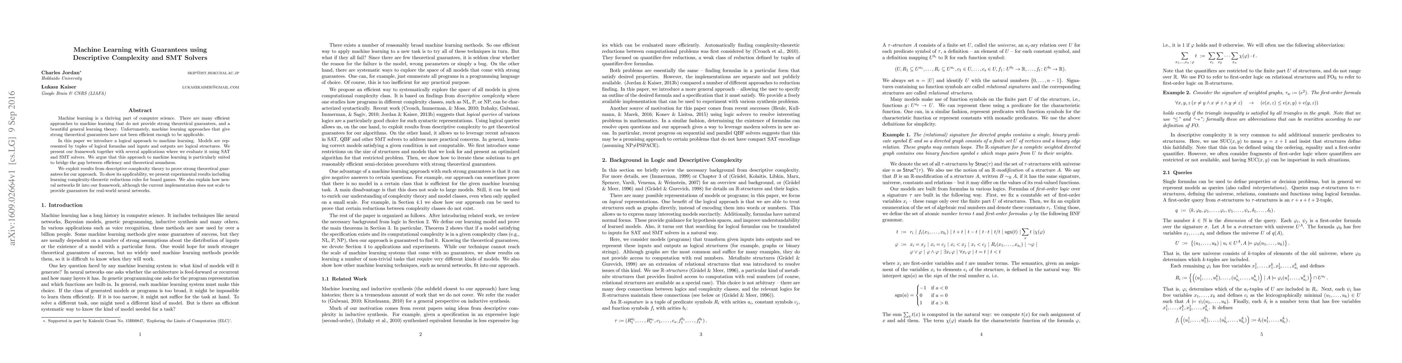 This paper proposes a logical framework for machine learning that combines descriptive complexity and SMT solvers to achieve both efficiency and strong theoretical guarantees. The authors demonstrate its applicability through experimental results on learning complexity-theoretic rules for board games and discuss the potential integration of neural networks within this framework.