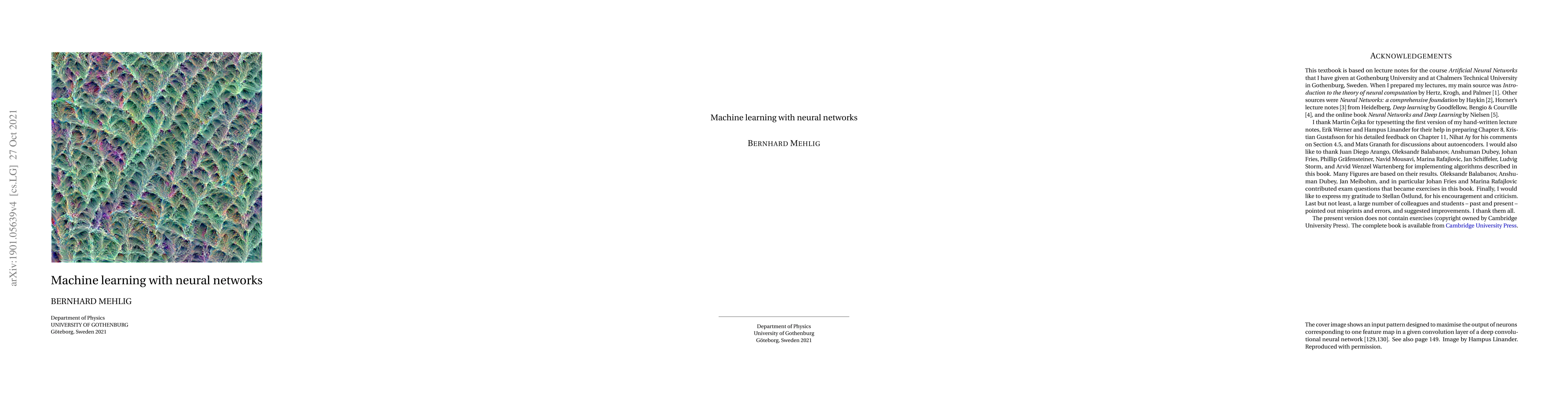 This lecture notes course covers machine learning with neural networks, organized into three parts: Hopfield networks, supervised learning with multilayer perceptrons and convolutional networks, and unsupervised learning techniques including clustering and reinforcement learning. The aim is to elucidate the fundamental principles underlying neural network learning.
