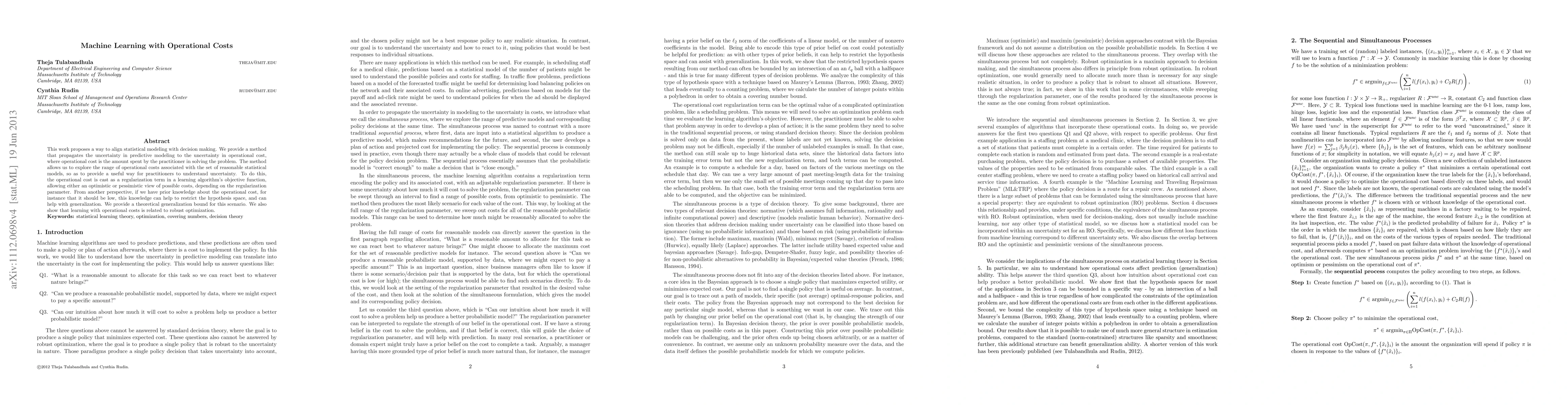 This paper introduces a method to integrate operational cost uncertainty into machine learning models, allowing practitioners to understand the cost implications of different statistical models. The operational cost is treated as a regularization term in the learning algorithm, providing flexibility in cost perspectives and aiding generalization when prior cost knowledge is available.