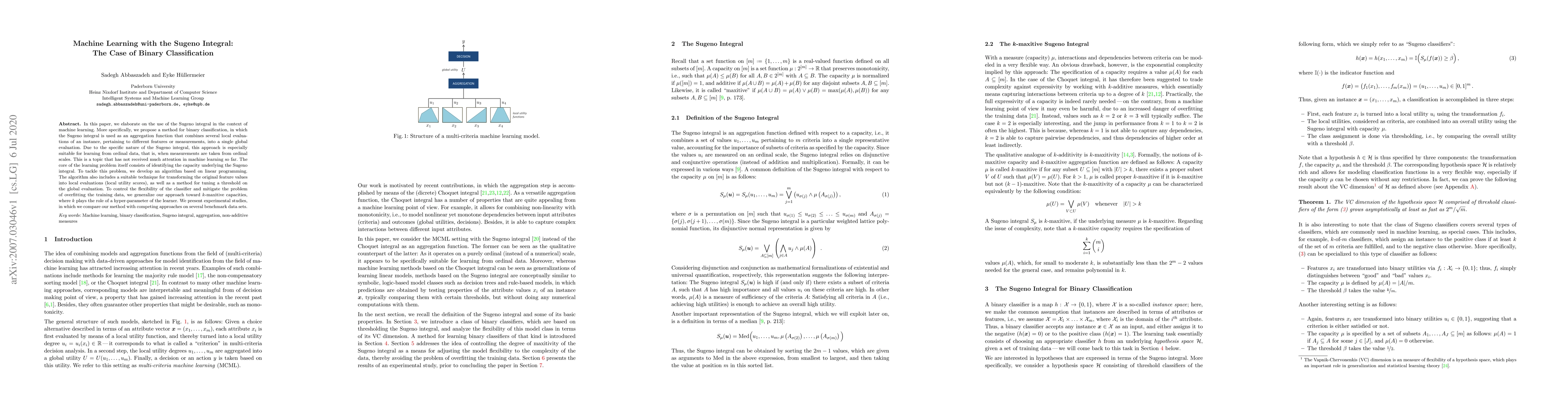 In this paper, we elaborate on the use of the Sugeno integral in the context of machine learning. More specifically, we propose a method for binary classification, in which the Sugeno integral is used as an aggregation function that combines several local evaluations of an instance, pertaining to different features or measurements, into a single global evaluation. Due to the specific nature of the Sugeno integral, this approach is especially suitable for learning from ordinal data, that is, when measurements are taken from ordinal scales. This is a topic that has not received much attention in machine learning so far. The core of the learning problem itself consists of identifying the capacity underlying the Sugeno integral. To tackle this problem, we develop an algorithm based on linear programming. The algorithm also includes a suitable technique for transforming the original feature values into local evaluations (local utility scores), as well as a method for tuning a threshold on the global evaluation. To control the flexibility of the classifier and mitigate the problem of overfitting the training data, we generalize our approach toward $k$-maxitive capacities, where $k$ plays the role of a hyper-parameter of the learner. We present experimental studies, in which we compare our method with competing approaches on several benchmark data sets.
