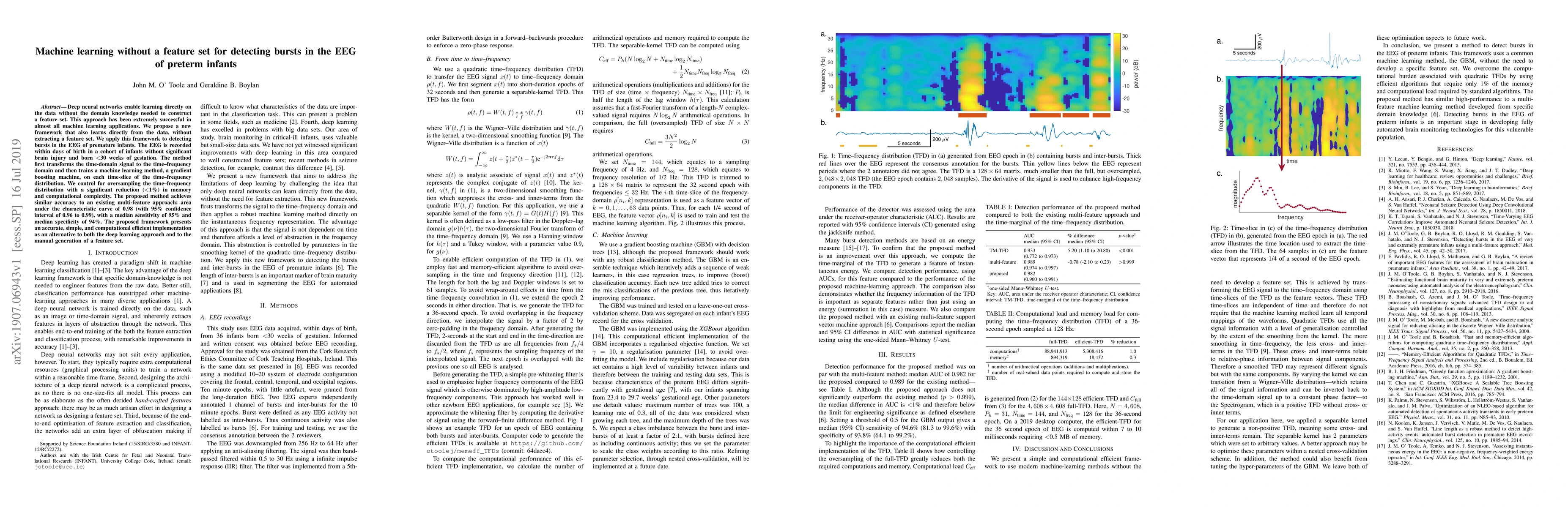 Deep neural networks enable learning directly on the data without the domain knowledge needed to construct a feature set. This approach has been extremely successful in almost all machine learning applications. We propose a new framework that also learns directly from the data, without extracting a feature set. We apply this framework to detecting bursts in the EEG of premature infants. The EEG is recorded within days of birth in a cohort of infants without significant brain injury and born <30 weeks of gestation. The method first transforms the time-domain signal to the time--frequency domain and then trains a machine learning method, a gradient boosting machine, on each time-slice of the time--frequency distribution. We control for oversampling the time--frequency distribution with a significant reduction (<1%) in memory and computational complexity. The proposed method achieves similar accuracy to an existing multi-feature approach: area under the characteristic curve of 0.98 (with 95% confidence interval of 0.96 to 0.99), with a median sensitivity of 95% and median specificity of 94%. The proposed framework presents an accurate, simple, and computational efficient implementation as an alternative to both the deep learning approach and to the manual generation of a feature set.