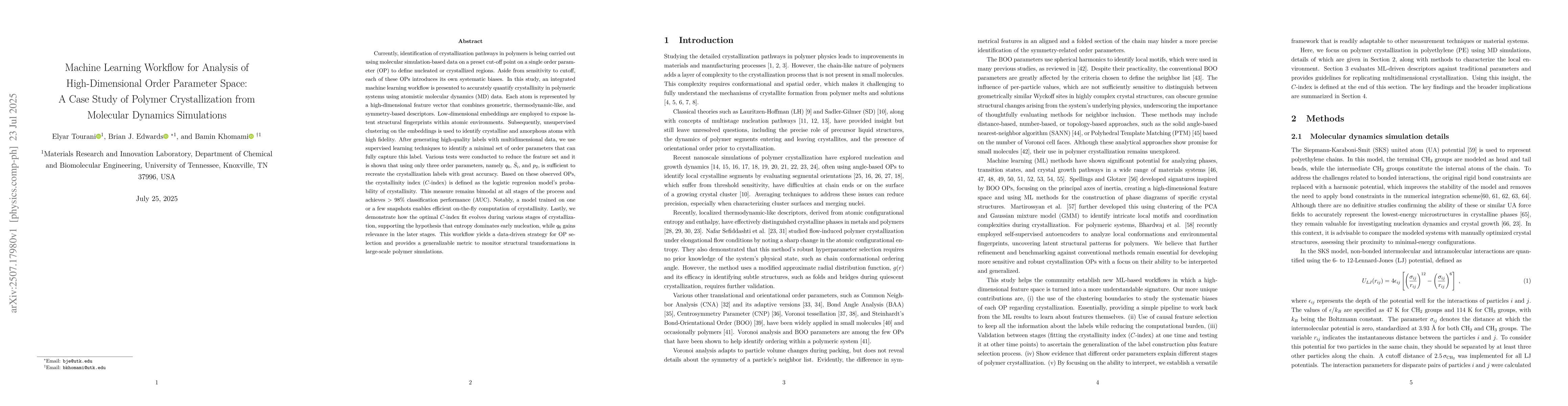 Currently, identification of crystallization pathways in polymers is being carried out using molecular simulation-based data on a preset cut-off point on a single order parameter (OP) to define nucleated or crystallized regions. Aside from sensitivity to cut-off, each of these OPs introduces its own systematic biases. In this study, an integrated machine learning workflow is presented to accurately quantify crystallinity in polymeric systems using atomistic molecular dynamics data. Each atom is represented by a high-dimensional feature vector that combines geometric, thermodynamic-like, and symmetry-based descriptors. Low dimensional embeddings are employed to expose latent structural fingerprints within atomic environments. Subsequently, unsupervised clustering on the embeddings identified crystalline and amorphous atoms with high fidelity. After generating high quality labels with multidimensional data, we use supervised learning techniques to identify a minimal set of order parameters that can fully capture this label. Various tests were conducted to reduce the feature set, demonstrating that using only three order parameters is sufficient to recreate the crystallization labels. Based on these observed OPs, the crystallinity index (C-index) is defined as the logistic regression model's probability of crystallinity, remaining bimodal throughout the process and achieving over 0.98 classification performance (AUC). Notably, a model trained on one or a few snapshots enables efficient on-the-fly computation of crystallinity. Lastly, we demonstrate how the optimal C-index fit evolves during various stages of crystallization, supporting the hypothesis that entropy dominates early nucleation, while symmetry gains relevance later. This workflow provides a data-driven strategy for OP selection and a metric to monitor structural transformations in large-scale polymer simulations.