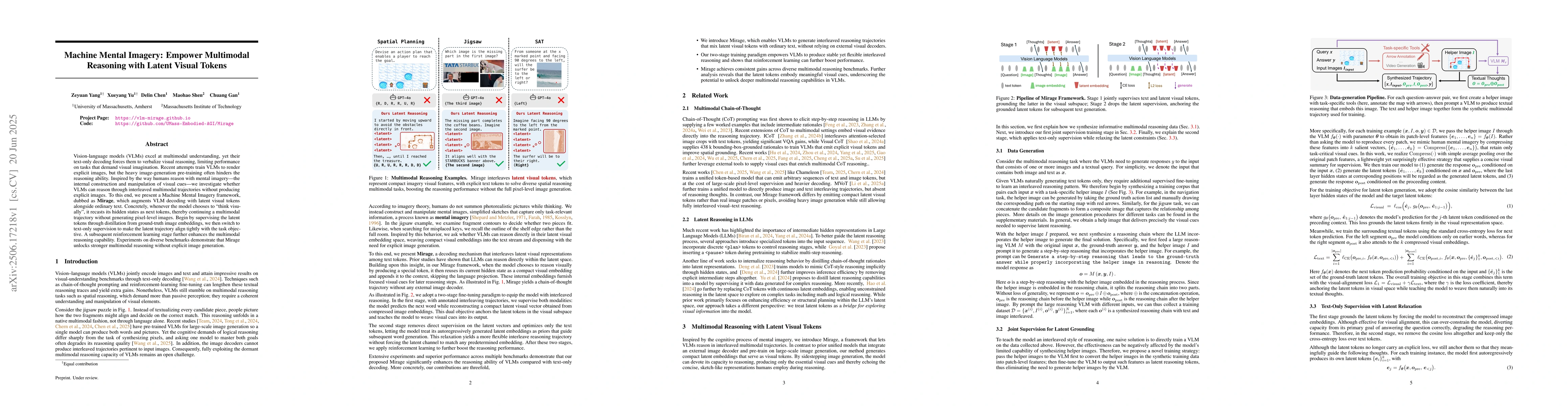 Vision-language models (VLMs) excel at multimodal understanding, yet their text-only decoding forces them to verbalize visual reasoning, limiting performance on tasks that demand visual imagination. Recent attempts train VLMs to render explicit images, but the heavy image-generation pre-training often hinders the reasoning ability. Inspired by the way humans reason with mental imagery-the internal construction and manipulation of visual cues-we investigate whether VLMs can reason through interleaved multimodal trajectories without producing explicit images. To this end, we present a Machine Mental Imagery framework, dubbed as Mirage, which augments VLM decoding with latent visual tokens alongside ordinary text. Concretely, whenever the model chooses to ``think visually'', it recasts its hidden states as next tokens, thereby continuing a multimodal trajectory without generating pixel-level images. Begin by supervising the latent tokens through distillation from ground-truth image embeddings, we then switch to text-only supervision to make the latent trajectory align tightly with the task objective. A subsequent reinforcement learning stage further enhances the multimodal reasoning capability. Experiments on diverse benchmarks demonstrate that Mirage unlocks stronger multimodal reasoning without explicit image generation.