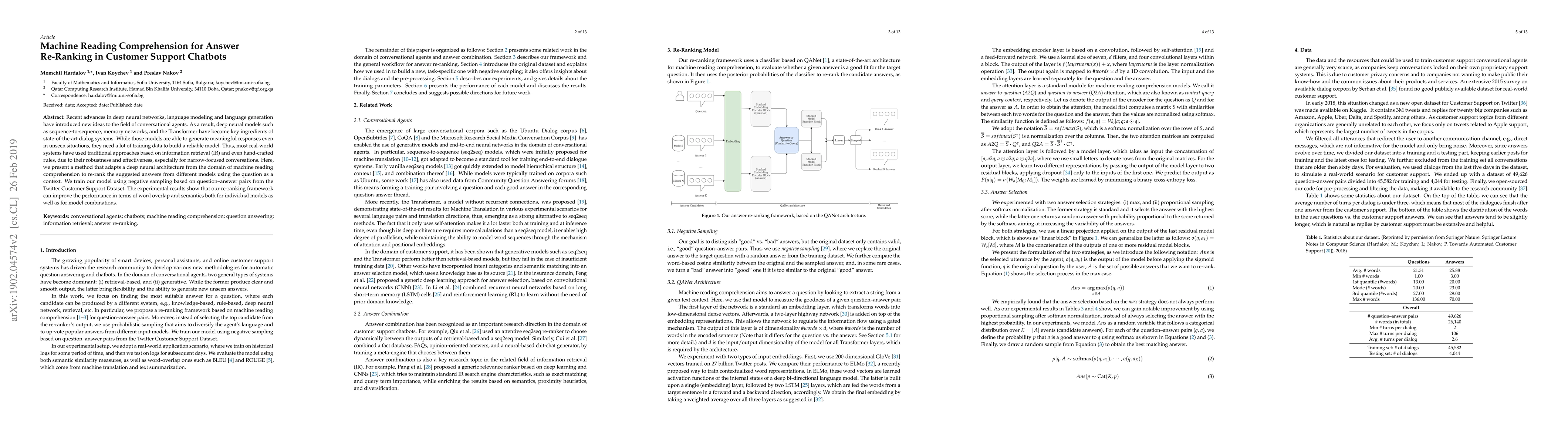 Recent advances in deep neural networks, language modeling and language generation have introduced new ideas to the field of conversational agents. As a result, deep neural models such as sequence-to-sequence, Memory Networks, and the Transformer have become key ingredients of state-of-the-art dialog systems. While those models are able to generate meaningful responses even in unseen situation, they need a lot of training data to build a reliable model. Thus, most real-world systems stuck to traditional approaches based on information retrieval and even hand-crafted rules, due to their robustness and effectiveness, especially for narrow-focused conversations. Here, we present a method that adapts a deep neural architecture from the domain of machine reading comprehension to re-rank the suggested answers from different models using the question as context. We train our model using negative sampling based on question-answer pairs from the Twitter Customer Support Dataset.The experimental results show that our re-ranking framework can improve the performance in terms of word overlap and semantics both for individual models as well as for model combinations.