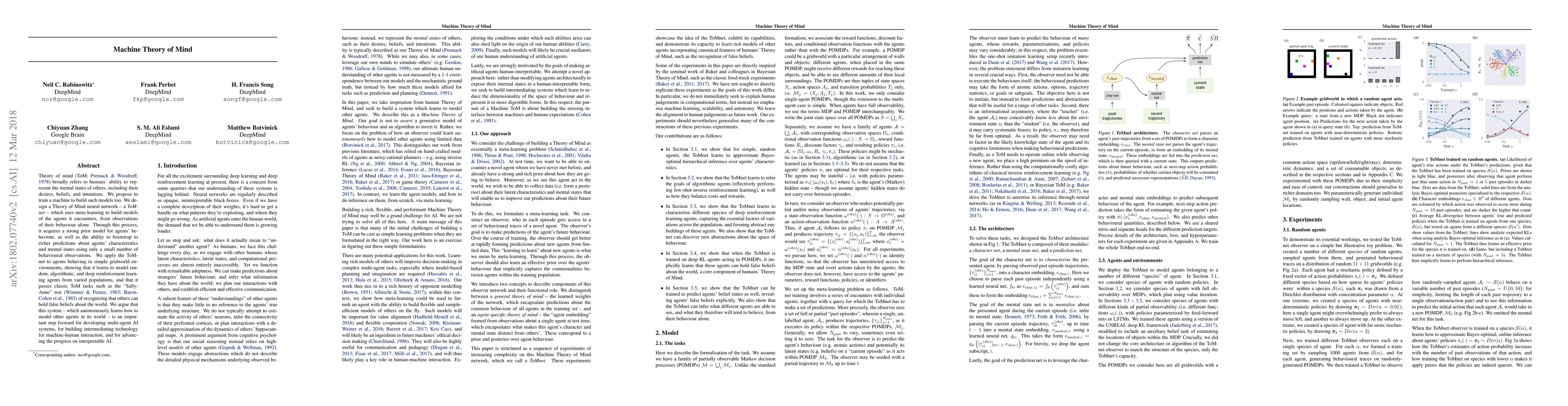 This paper proposes a Theory of Mind neural network (ToMnet) that uses meta-learning to autonomously model the mental states of various agents from their behavior. The ToMnet demonstrates the ability to pass classic Theory of Mind tasks and is argued to be a significant step towards multi-agent AI systems and interpretable AI.