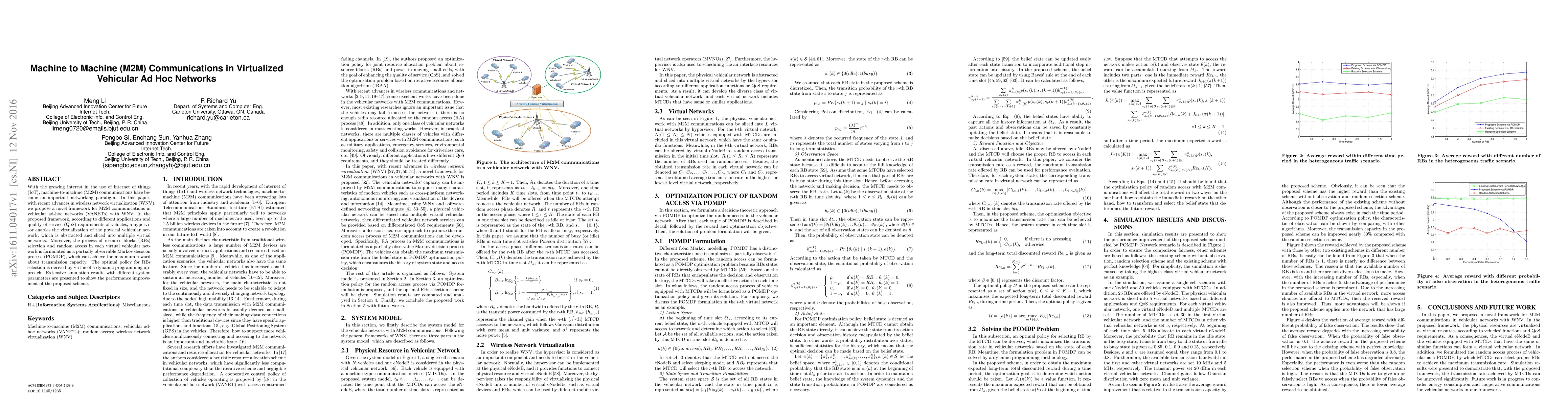 This paper proposes a novel framework for M2M communications in virtualized vehicular ad-hoc networks (VANETs) using wireless network virtualization. The framework employs a hypervisor to slice the physical network into virtual networks, optimizing resource block selection via a POMDP-based approach to maximize transmission capacity.