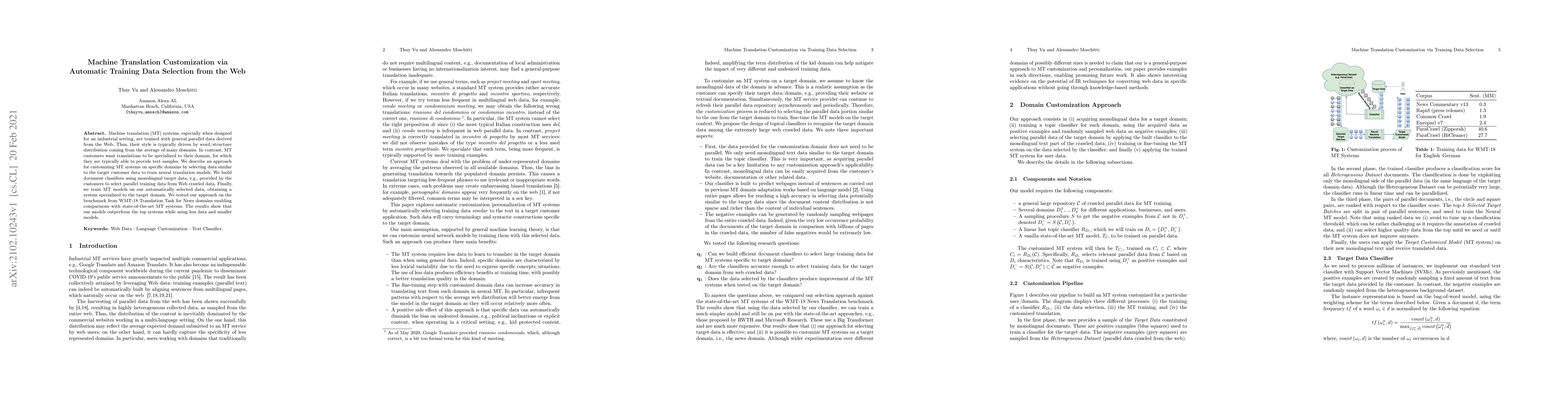 This paper proposes an approach to customize machine translation systems for specific domains by automatically selecting relevant training data from the web. The method uses document classifiers built from customer-provided monolingual data to identify suitable parallel data, which is then used to train specialized neural translation models, achieving better performance compared to state-of-the-art systems with less data and smaller models.